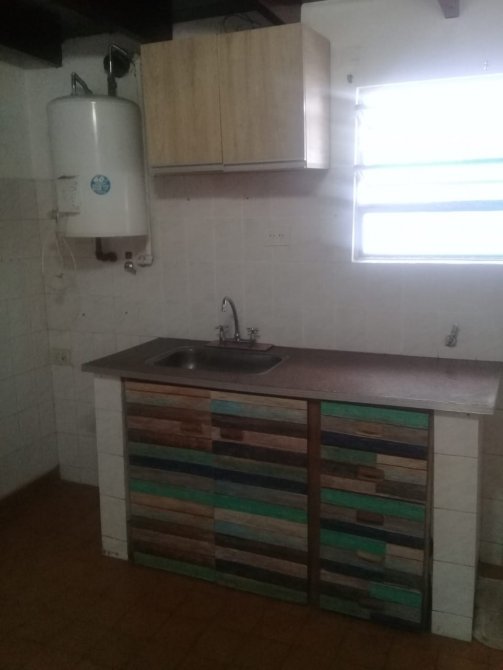 Cocina-comedor con alacena, mesada, bajomesada, cocina y termo eléctrico.