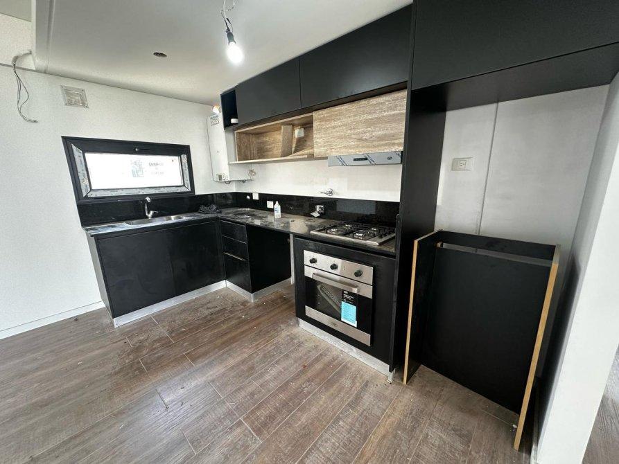 - Cocina con mueble bajo y sobre mesada (alacena), Mesada de Purastone, Anafe y Horno a Gas.