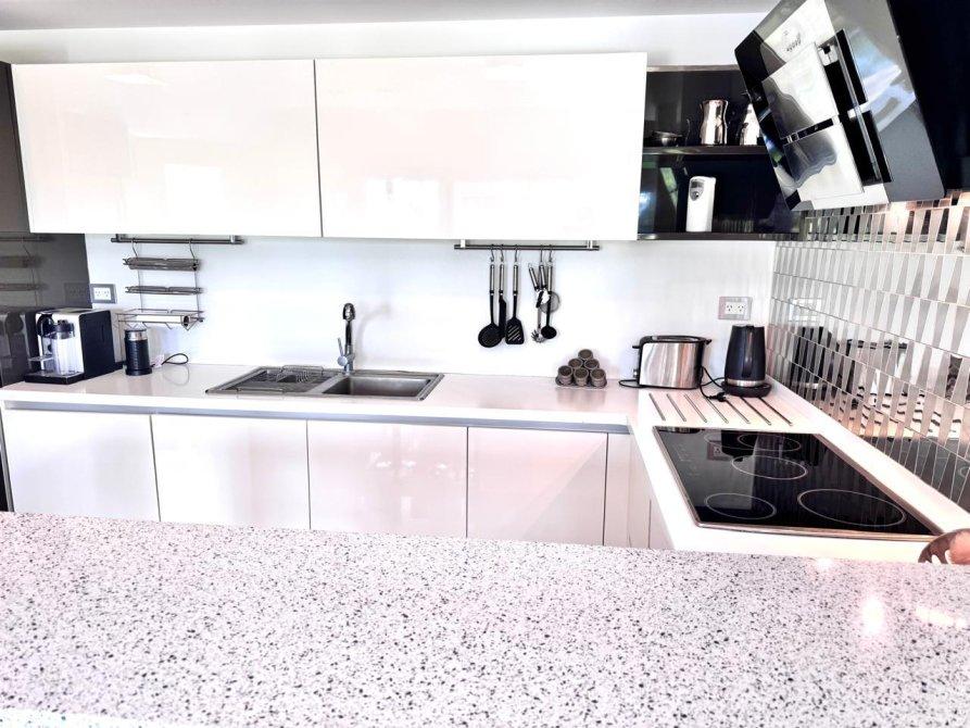 En planta baja: Al ingresar,  amplio living, comedor y cocina totalmente amueblada con equipamiento Johnson Acero, y equipada con heladera, cava, cocina, horno, microondas y extractor.
