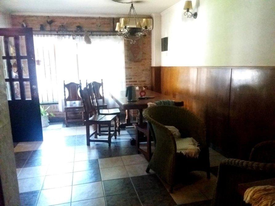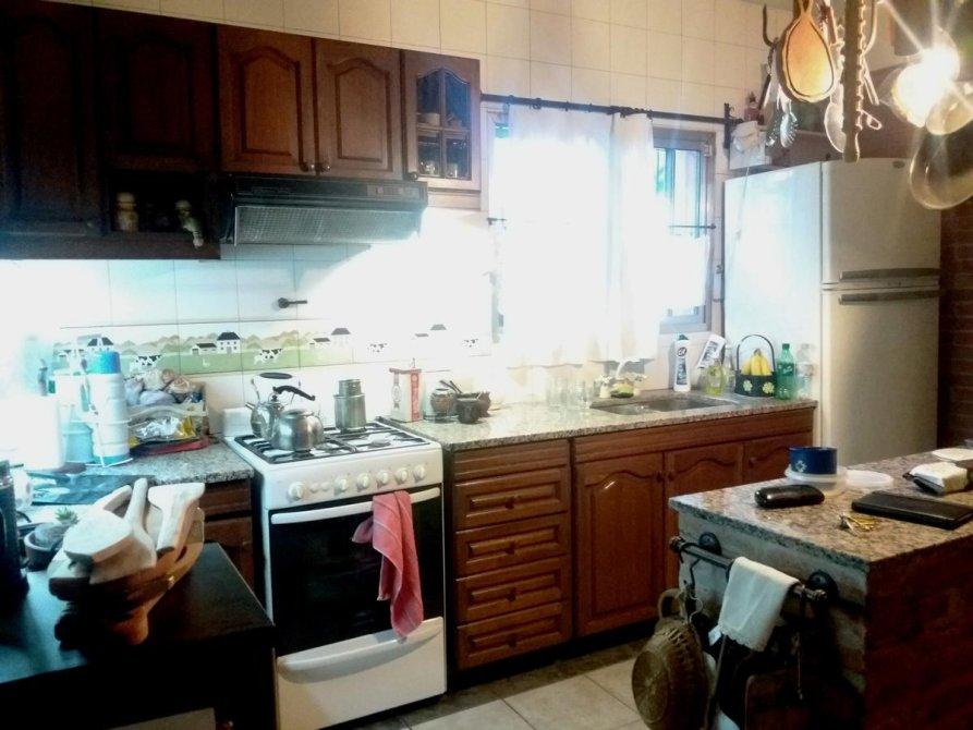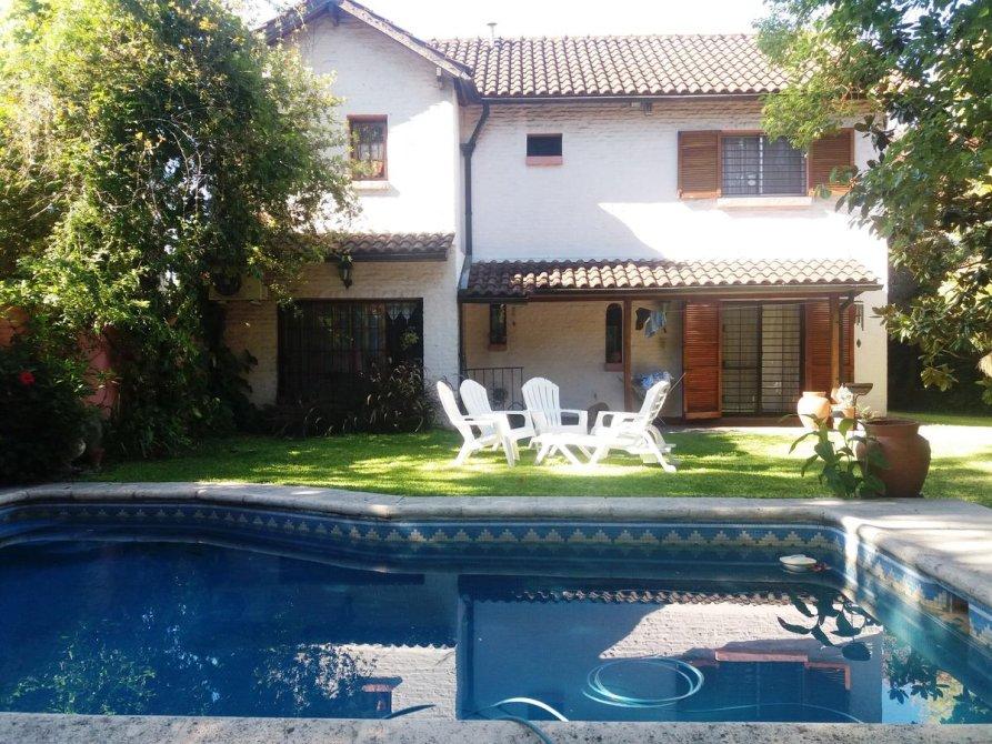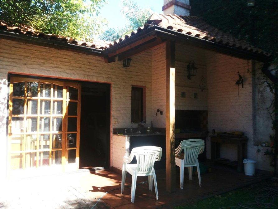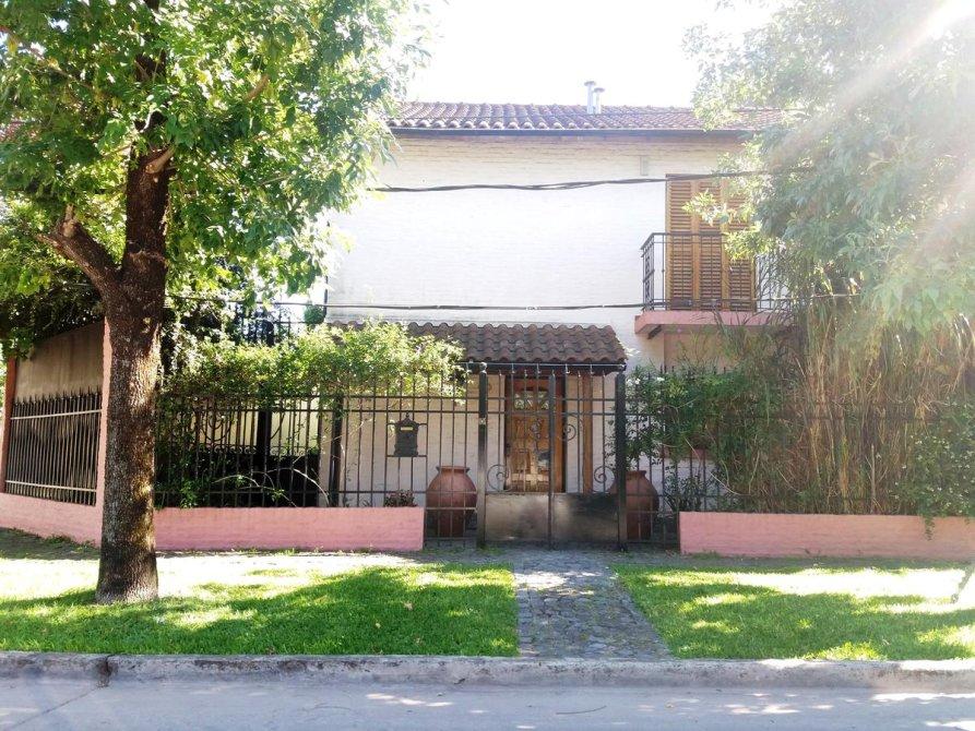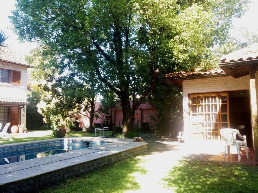 Galería, jardín arbolado y parquizado, piscina, garage para 2 autos, parrilla, habitación guarda útiles, fondo libre.