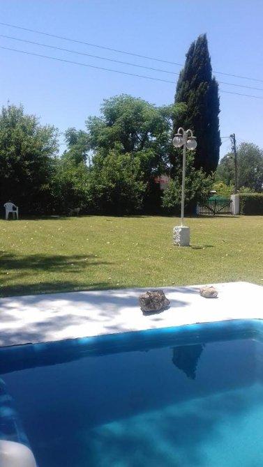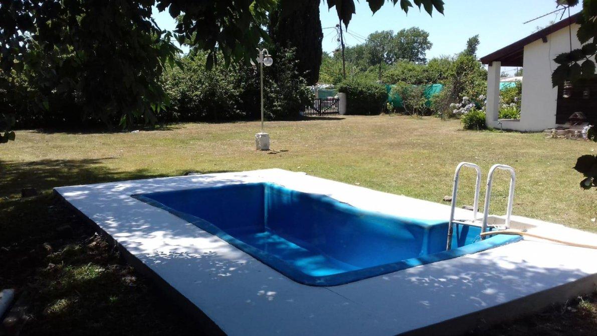 Jardín al frente con rejas, living comedor con cocina comedor diario integrado, baño completo, 2 dormitorios con placard. Fondo libre parquizado con piscina, parrilla y casa de caseros  de 60 m2,  con hab. guarda útiles.