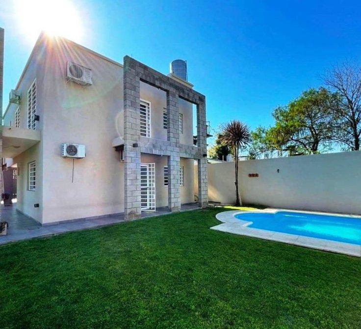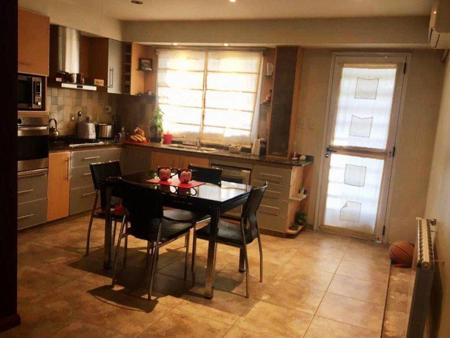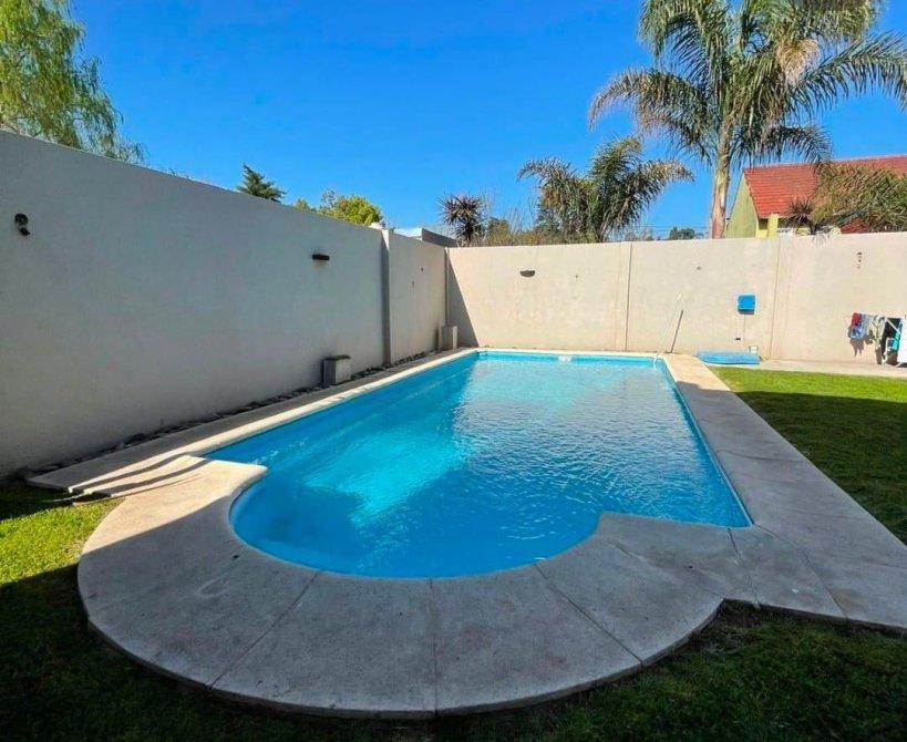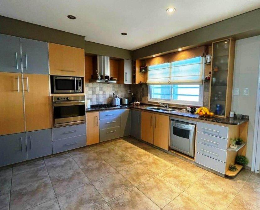 PB: Living comedor, cocina comedor diario totalmente amoblada, baño completo,lavadero cubierto, 1 dormitorio, con placard. Cochera cubierta ,quincho con cocina, piscina con fondo y jardín, habitación guarda útiles.