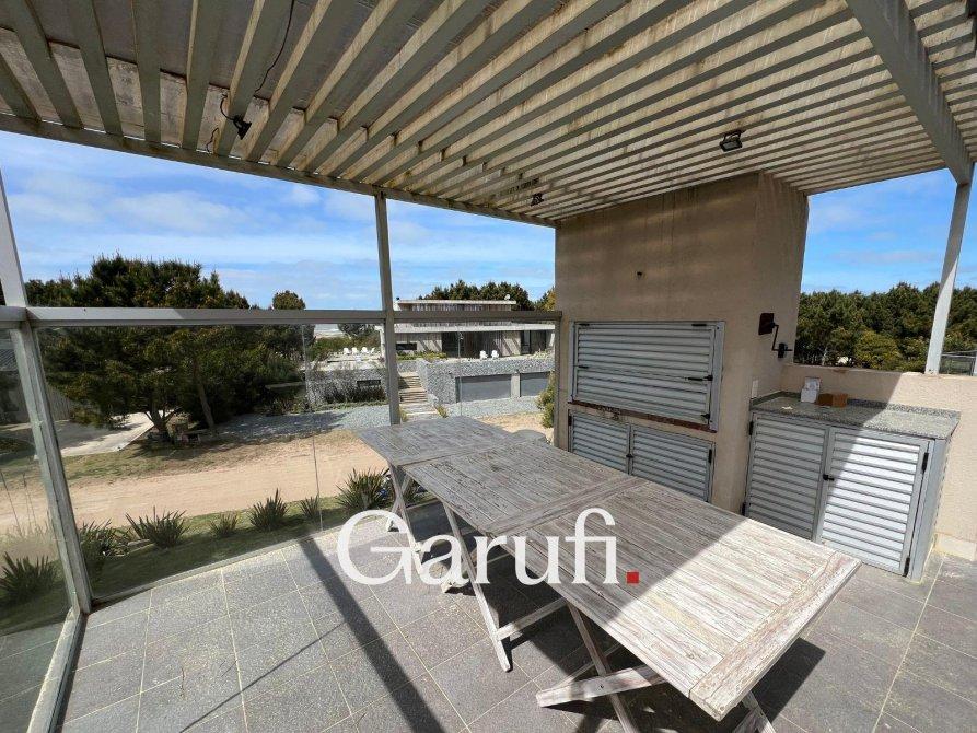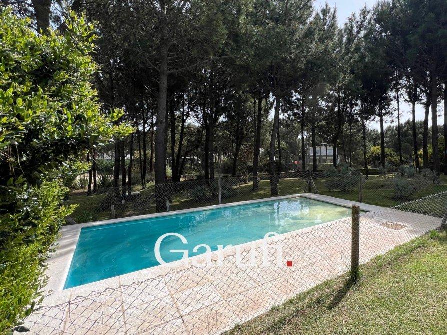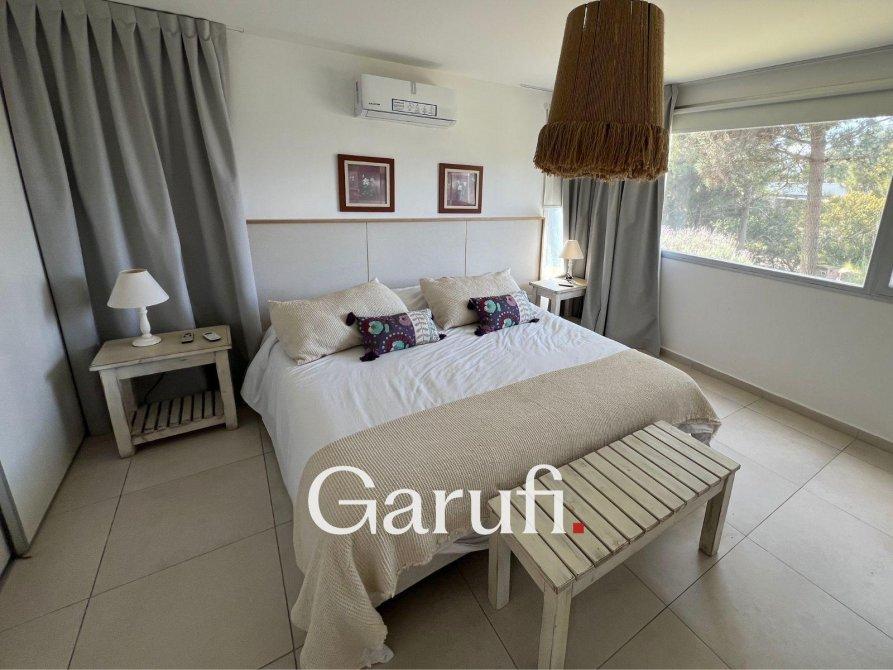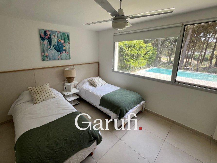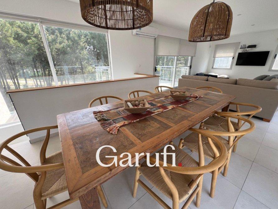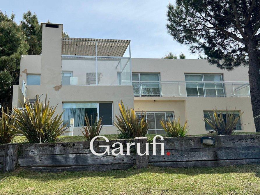 Capacidad: Equipado con sommiers para 8 a 10 personas, 4 TV HD, DirecTV y Wi-Fi.Áreas al Aire Libre: Cuenta con una parrilla, terraza con vista al mar, terraza con vista al bosque y una piscina climatizada.Dormitorios y Baños: Cuatro dormitorios y dos baños completos. Además, incluye un quinto dormitorio que puede ser utilizado como dependencia de servicio o habitación multidestino, y un tercer baño.Áreas Comunes: Amplio living y comedor, play room.Cocina: Totalmente equipada con microondas, horno eléctrico, anafe y horno principal, lavavajillas y lavarropas.Garaje: Espacio para un auto y dos cuatriciclos.Servicios y Características Adicionales: