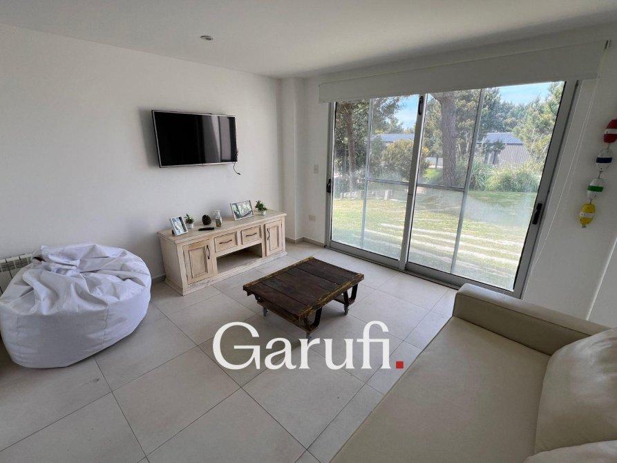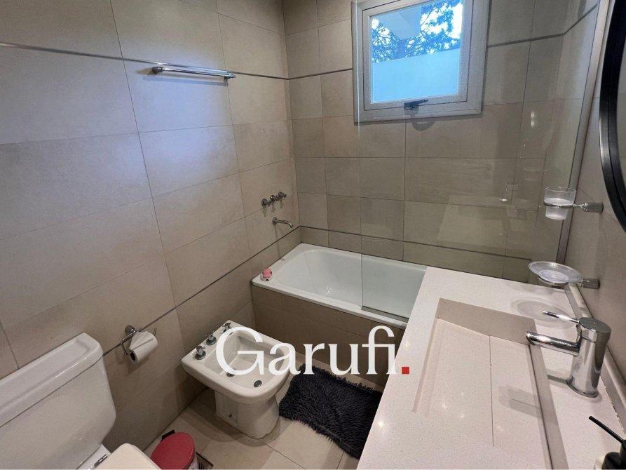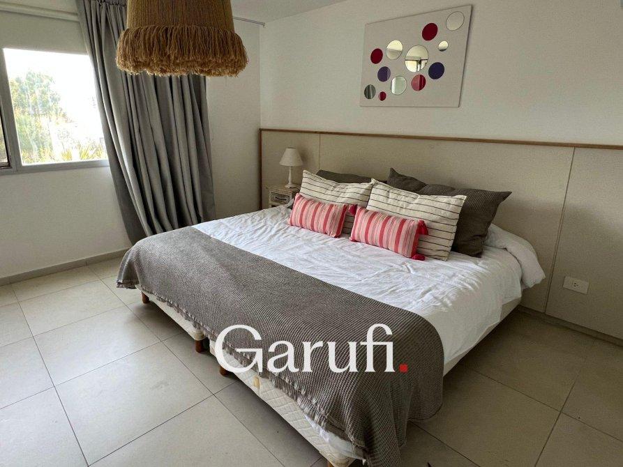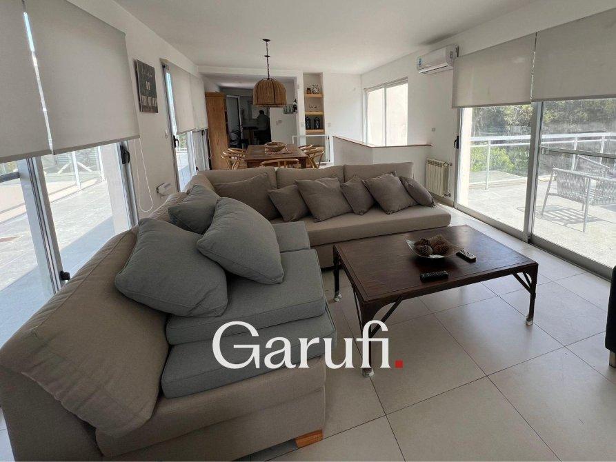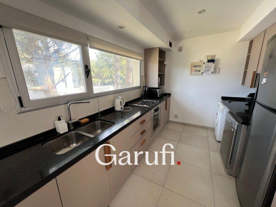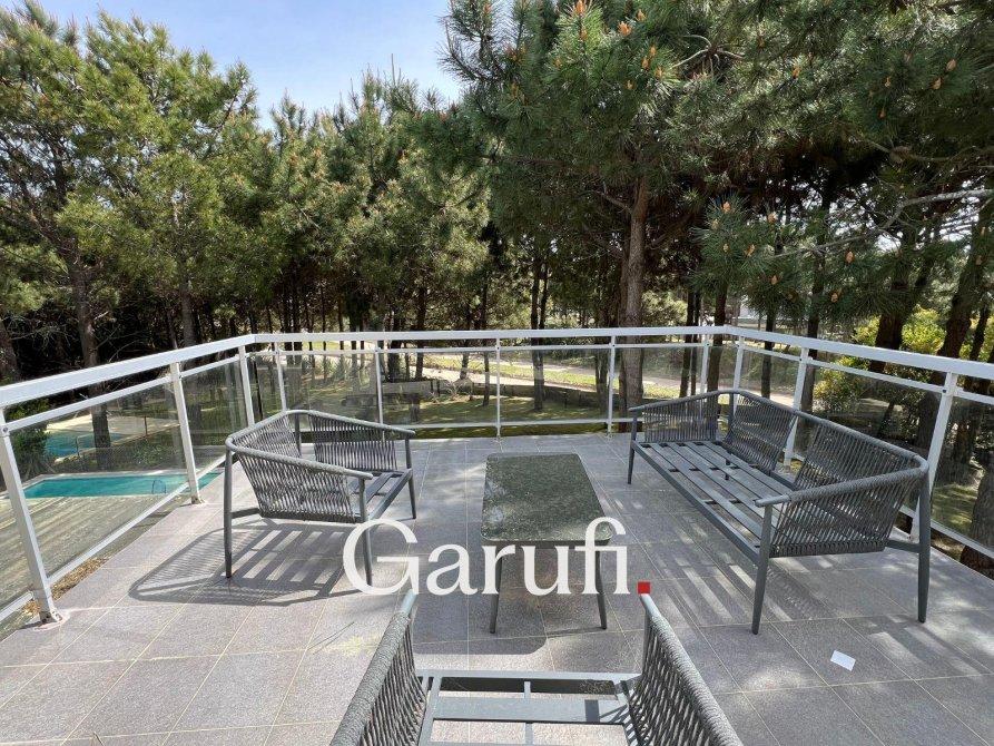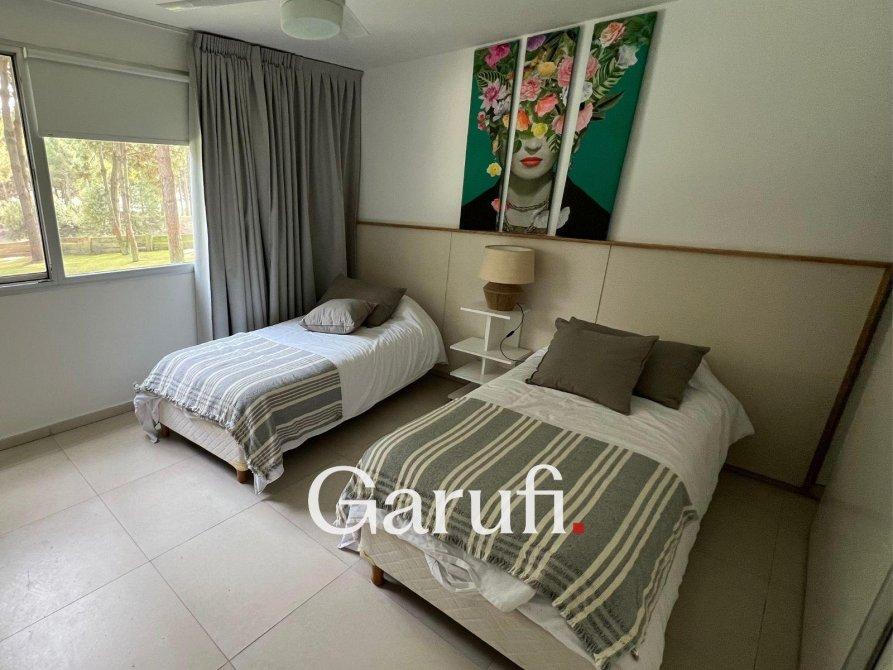 Capacidad: Equipado con sommiers para 8 a 10 personas, 4 TV HD, DirecTV y Wi-Fi.Áreas al Aire Libre: Cuenta con una parrilla, terraza con vista al mar, terraza con vista al bosque y una piscina climatizada.Dormitorios y Baños: Cuatro dormitorios y dos baños completos. Además, incluye un quinto dormitorio que puede ser utilizado como dependencia de servicio o habitación multidestino, y un tercer baño.Áreas Comunes: Amplio living y comedor, play room.Cocina: Totalmente equipada con microondas, horno eléctrico, anafe y horno principal, lavavajillas y lavarropas.Garaje: Espacio para un auto y dos cuatriciclos.Servicios y Características Adicionales: