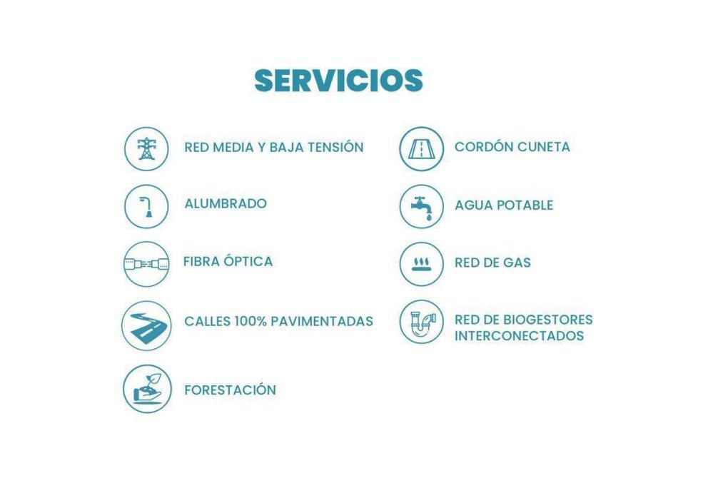 RED ELECTRICA DE BAJA Y MEDIA TENSION, AGUA POTABLE, CLOACAS, AMPLIA FORESTACION, PLANIFICADA, AVENIDAS PAVIMENTADAS, CORDON CUNETA, PLAZAS JERARQUIZADAS CON JUEGOS, ESPACIOS DEPORTIVOS, ALUMBRADOS PUBLICO LED, CAMARA DE SEGURIDAD, VELOCIDAD CONTROLADA, CONTENEDORES DE BASURA CON SEPARADORES, PLAZA PARA MASCOTAS