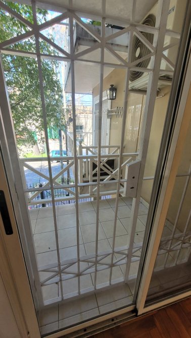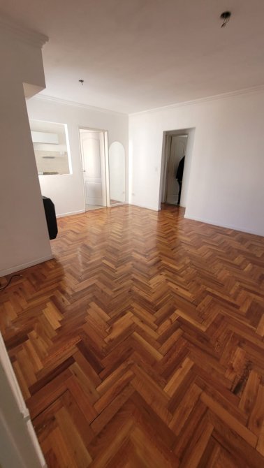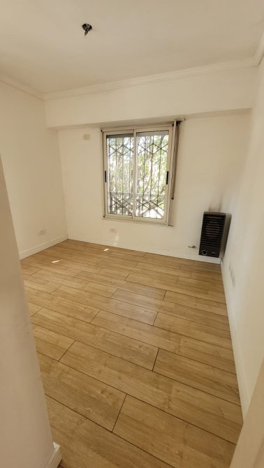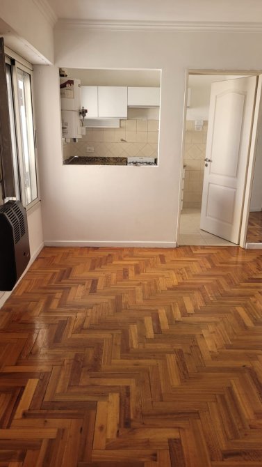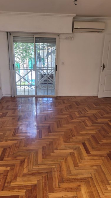 Departamento al frente en alquiler con dos dormitorios con placard, pisos de madera flotante y tiro balanceado. Living-comedor con salida al balcon, tiro balanceado y aire acondicionado. Cocina c/ muebles de bajo y sobre mesada, baño completo y cochera en planta baja.