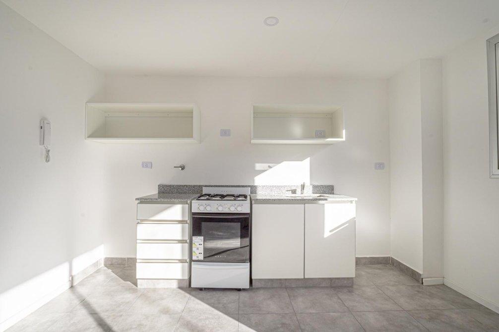 Cocina integrada con muebles bajo y sobre mesada, espacio para lavarropas, cocina a gas y extractor