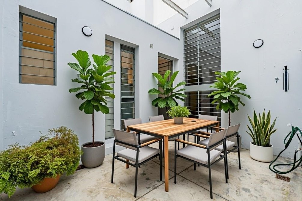 Baño completo, con excelente ventilación Baulera artesanal de madera debajo de la escalera, ideal como segundo placard. Dormitorio en planta alta, amplio y luminoso, con pisos de madera flotante, gran placard empotrado y ventanal al patio. Patio privado, perfecto para disfrutar al aire libre o compartir con amigos.
