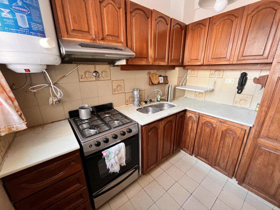 Cocina funcional con muebles de guardado.