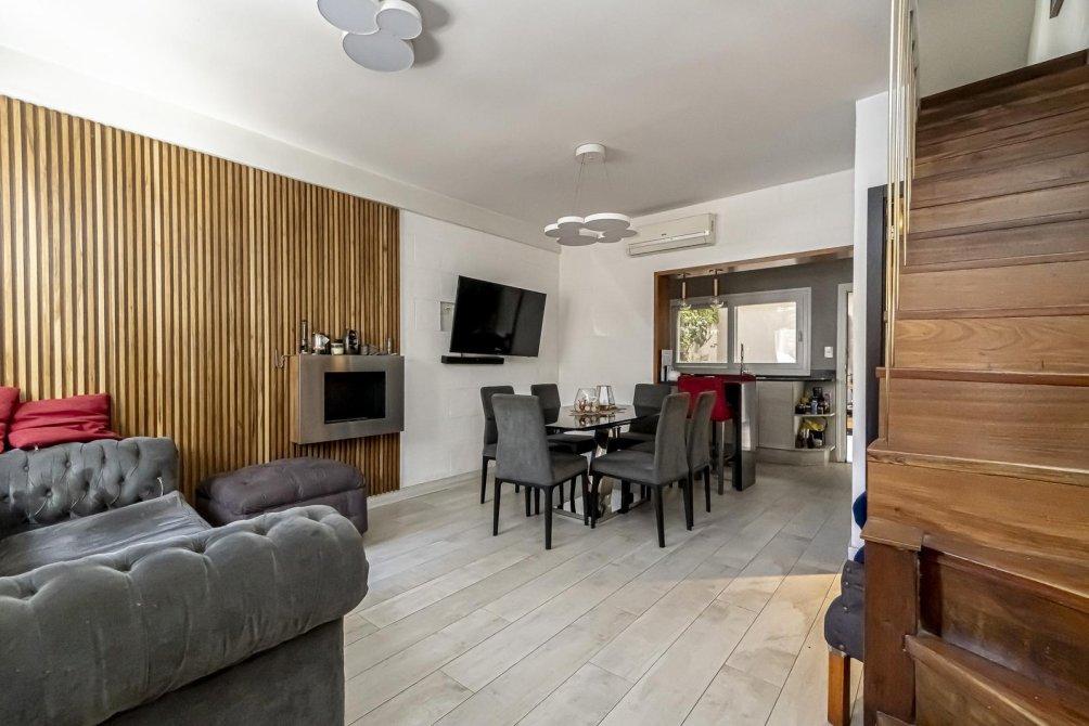 Planta Baja: Funcionalidad y Estilo Con una entrada totalmente independiente, el living comedor te da la bienvenida con un elegante piso de porcelanato que se fusiona con sutiles detalles de madera. La luz fluye a través de un amplio ventanal con persianas metálicas, destacando un cálido hogar, perfecto para las noches de invierno. El moderno toilette para visitas y un equipo de aire acondicionado split de gran capacidad garantizan tu confort.