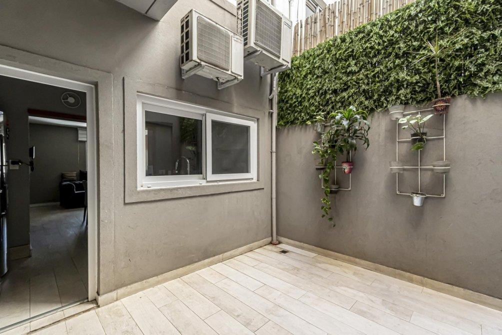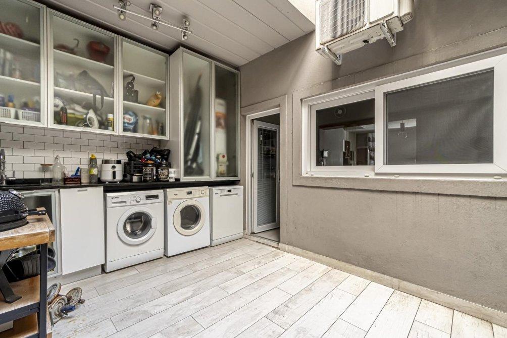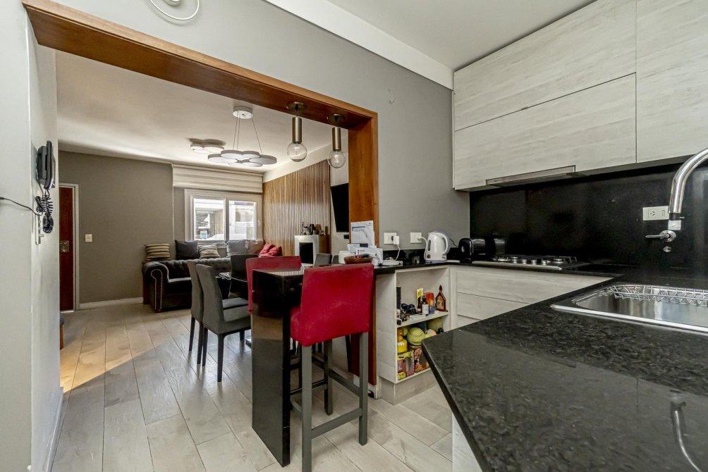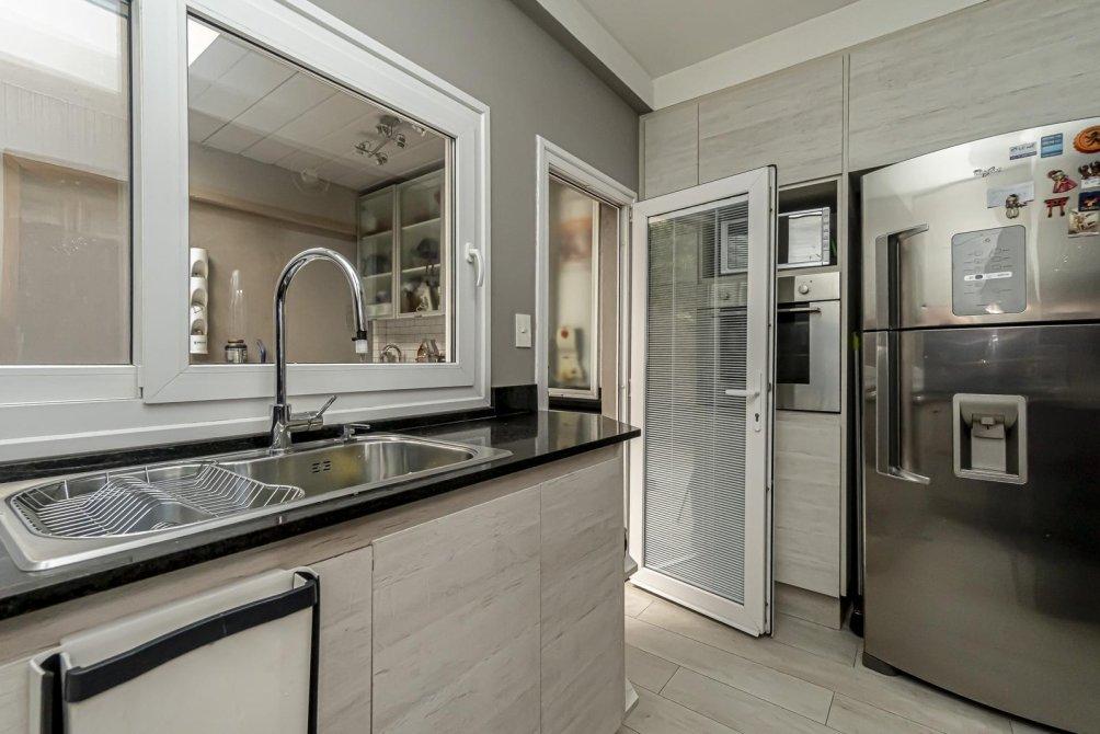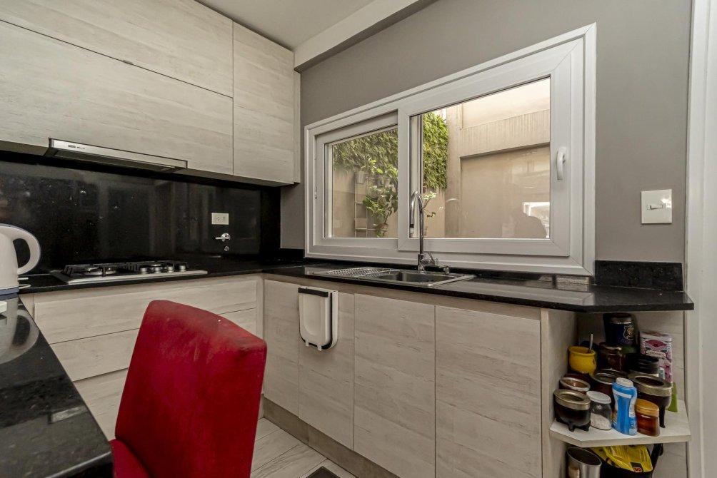 La cocina integrada es una obra de arte. Cuenta con una mesada de mármol negro en L, un anafe a gas, horno empotrado y un vasto espacio de guardado en alacenas. Un ventanal de alta calidad te conecta directamente con un patio semicubierto, un espacio pensado para el día a día. Aquí encontrarás una mesada de lavado con las conexiones necesarias para lavadora, secadora y lavavajillas, además de alacenas de aluminio anodizado con frente de vidrio que reflejan un diseño vanguardista. El agua caliente se provee a través de un termotanque.