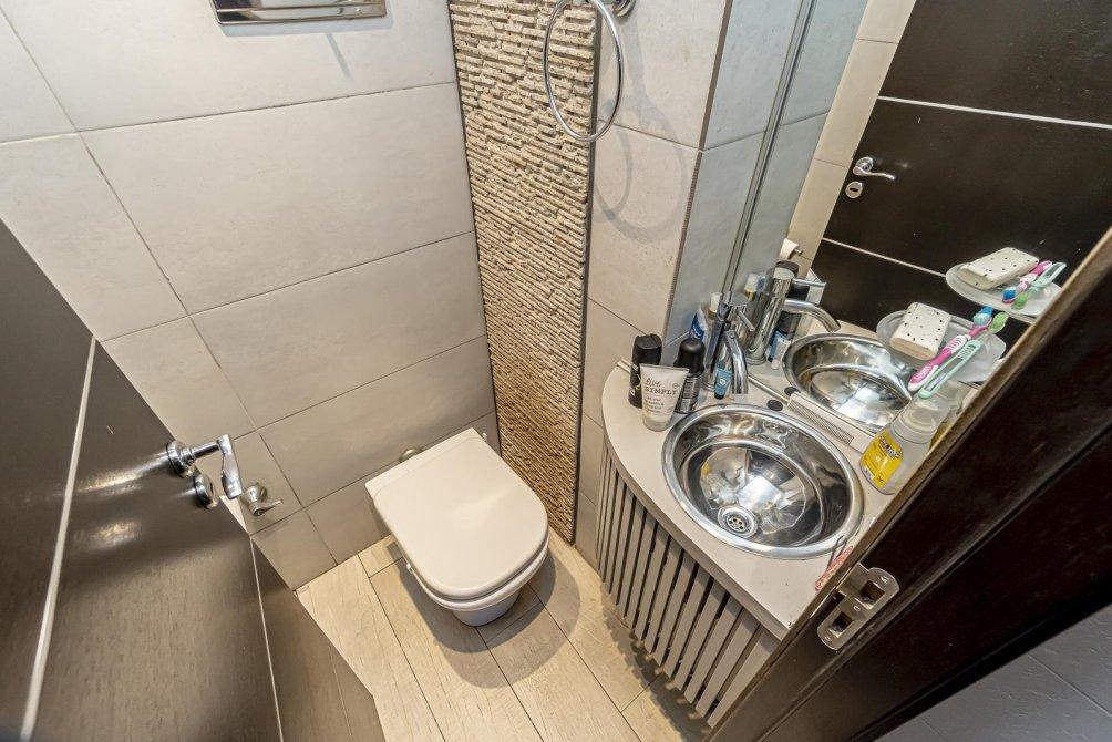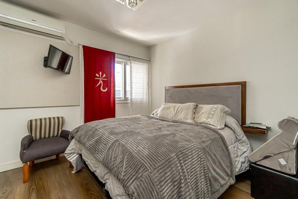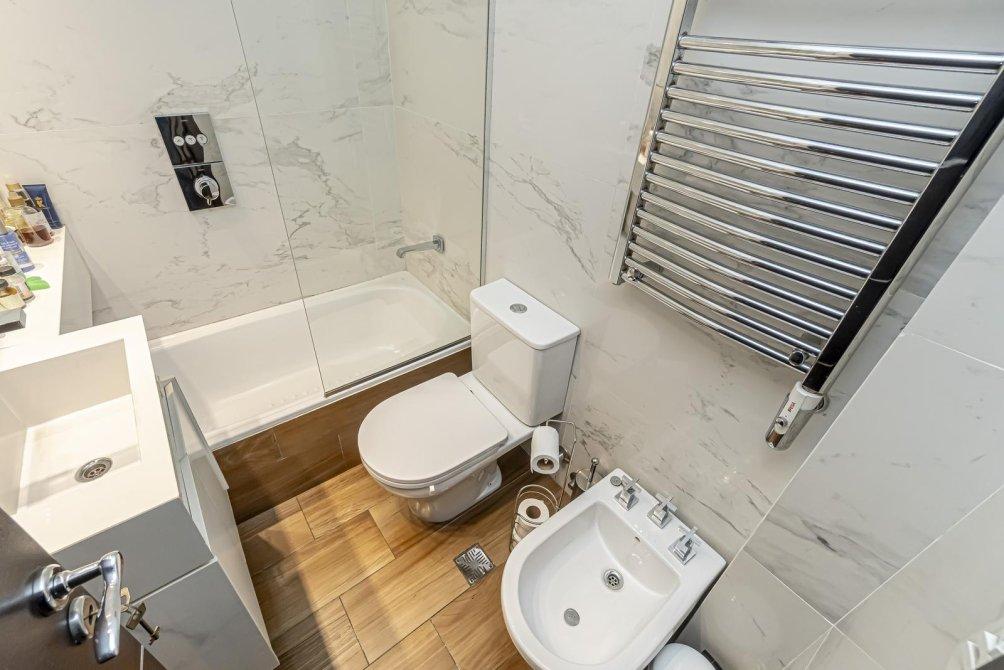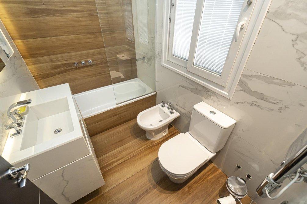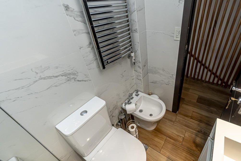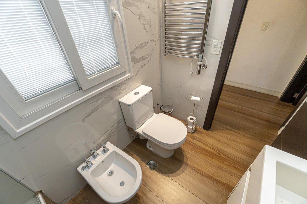 Un hall de distribución te guía hacia un baño de categoría superior, con pisos y paredes revestidos en porcelanato de alta calidad y una grifería de primera. La bañera se complementa con una ducha de tipo "cenital" y un calienta toallas eléctrico, que elevan la rutina diaria a un ritual de relajación. La habitación principal, con un amplio placard de puertas espejadas de piso a techo, recibe la luz a través de una ventana al frente. También equipada con su propio aire acondicionado split.