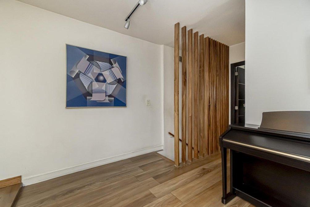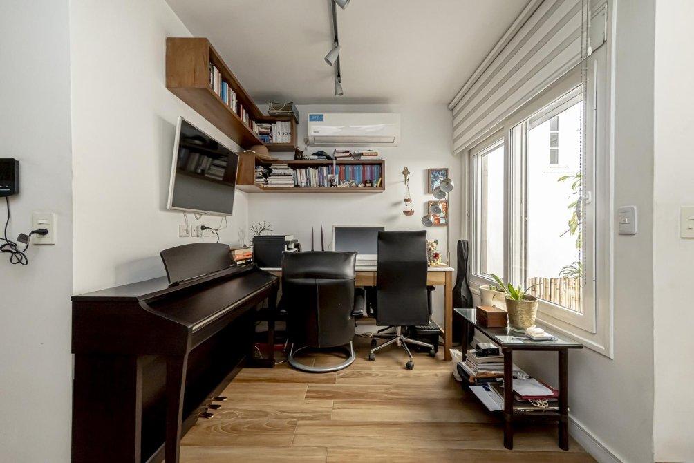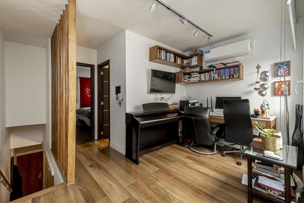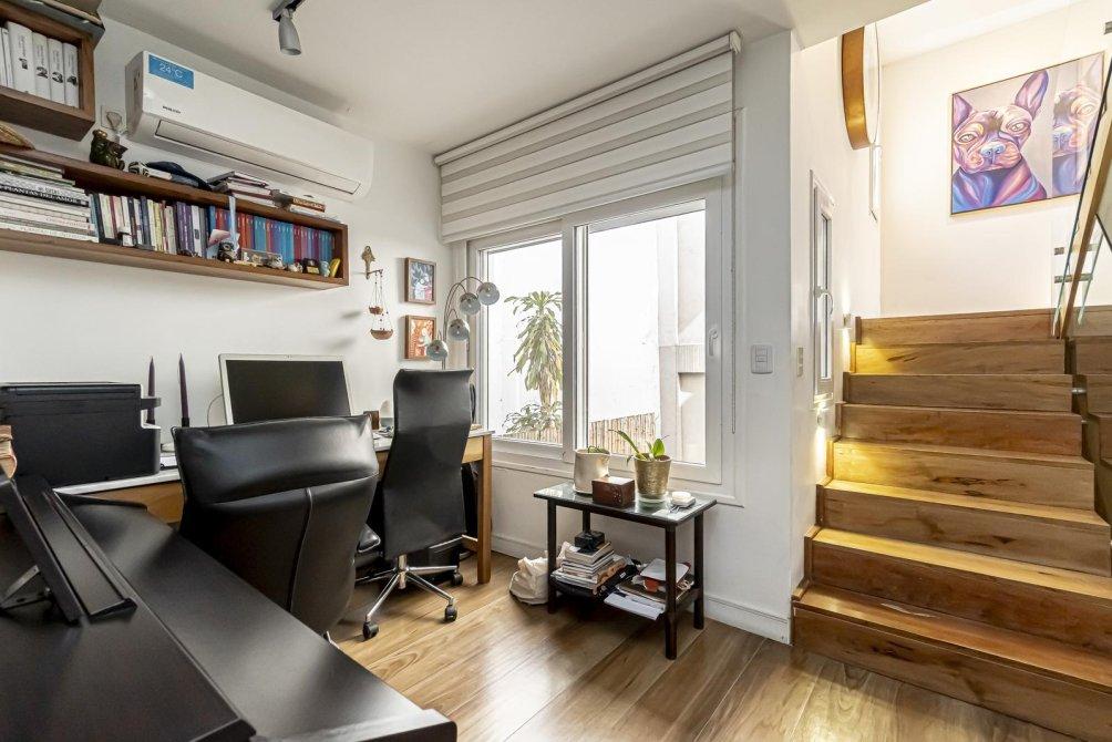 Planta 1: El Santuario Personal La conexión entre plantas es una experiencia en sí misma, a través de una escalera de madera lustrada. Al subir, te recibe un ambiente abierto, ideal como escritorio o sala de lectura, con un ventanal que da al patio. Un equipo de aire acondicionado split completa este espacio.