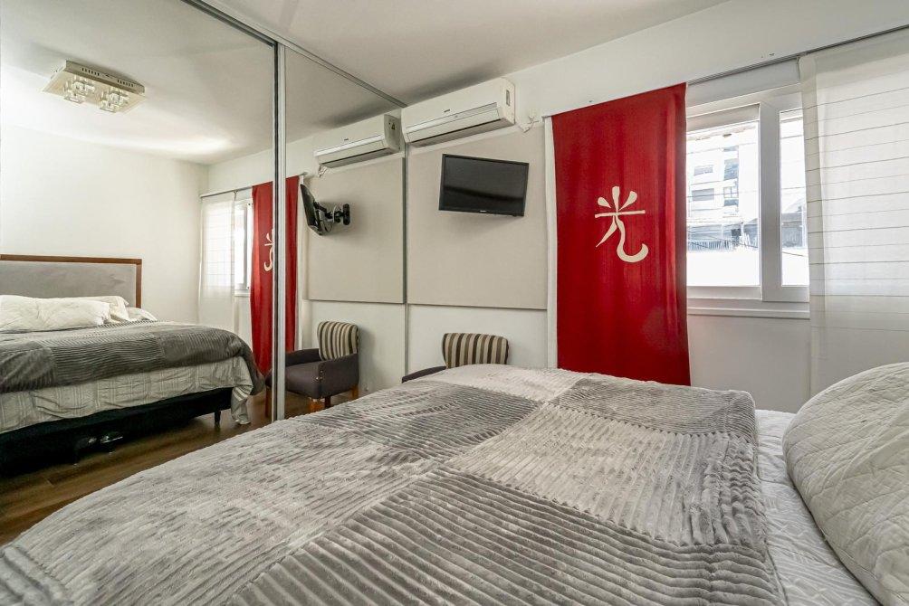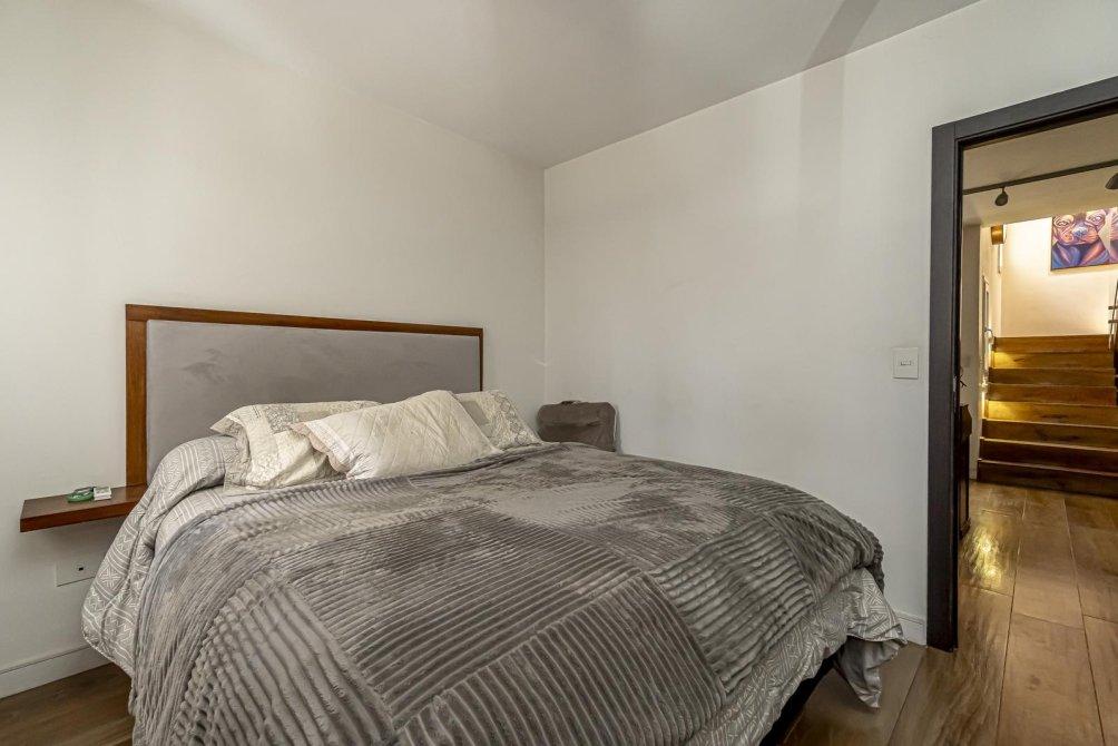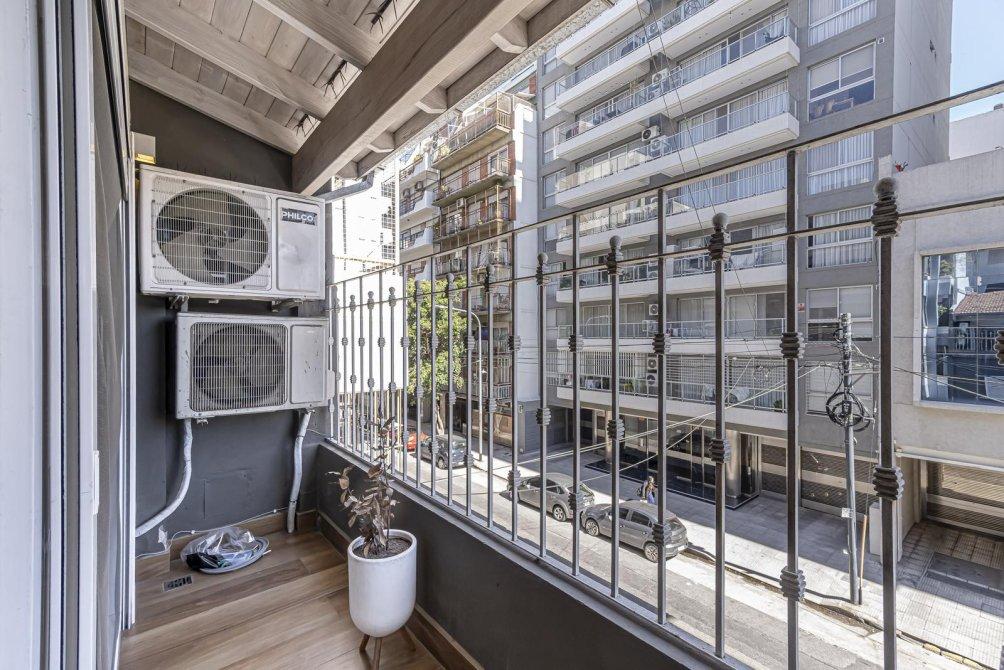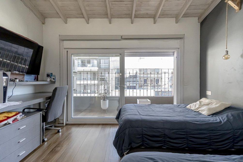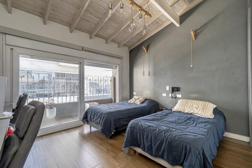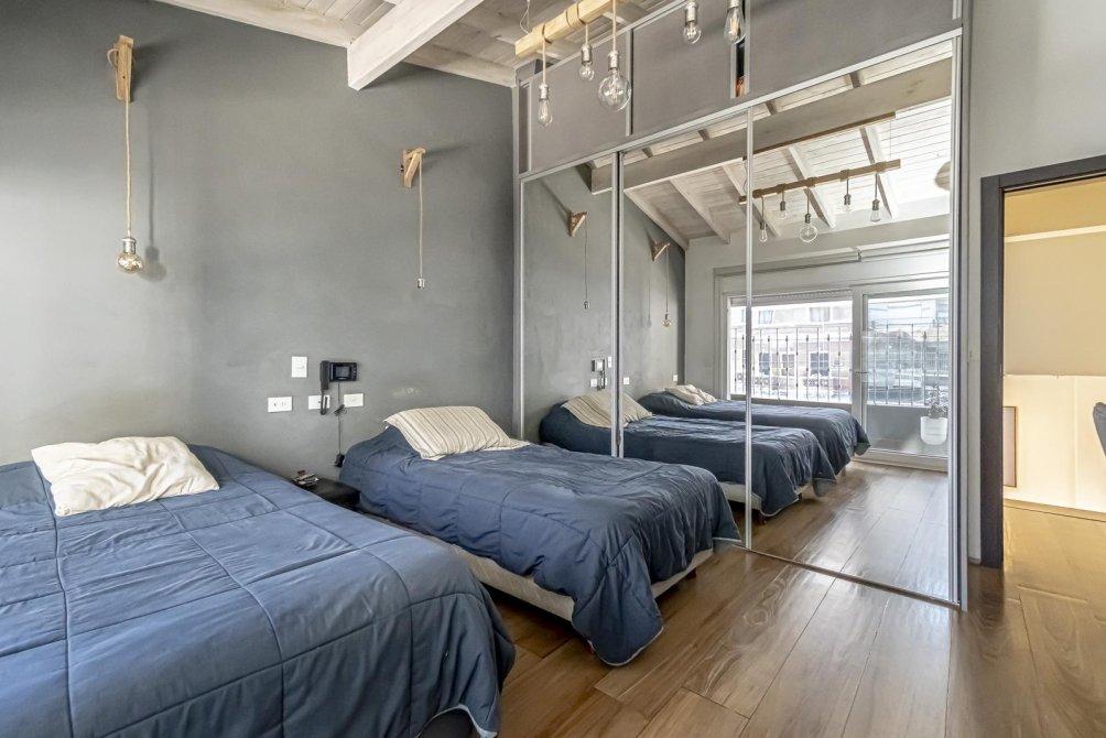 El baño completo mantiene el estándar de lujo, con revestimientos, artefactos y grifería de primera calidad, además de un calienta toallas eléctrico y un amplio ventanal. La espaciosa habitación destaca por su balcón a la calle a lo largo de todo el ambiente y un impresionante techo de madera a la vista. Incluye un placard con puertas espejadas de piso a techo y aire acondicionado split, ofreciendo además un amplio espacio para un escritorio doble.