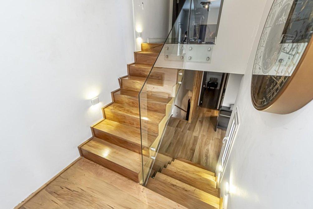 Planta 2: Vistas y Confort La escalera, con su iluminación de balizamiento, conduce a un descanso con área de guardado y un práctico acceso al tanque de agua a través de una escalera levadiza. Al llegar a la segunda planta, una baranda de vidrio templado enmarca el pequeño hall de distribución que conecta con el baño y la última habitación.