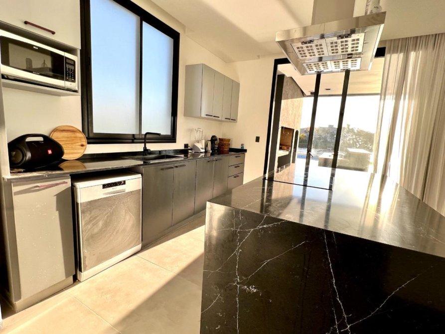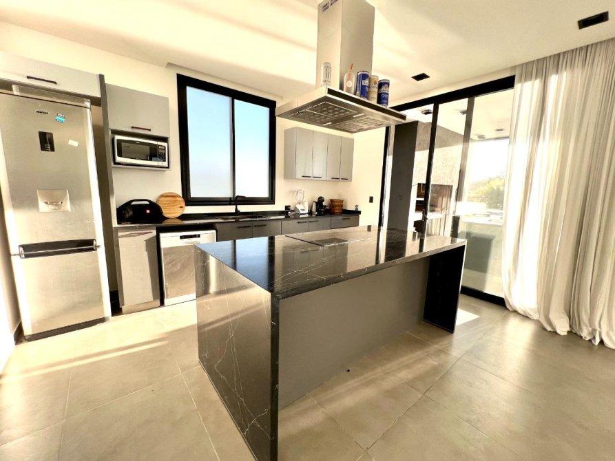 Living comedor integrado a la cocina con isla y grandes ventanales que ofrecen vistas privilegiadas a la laguna