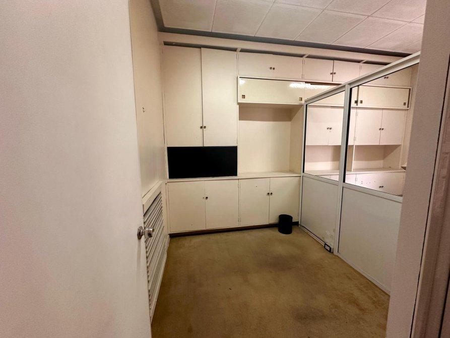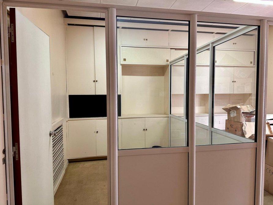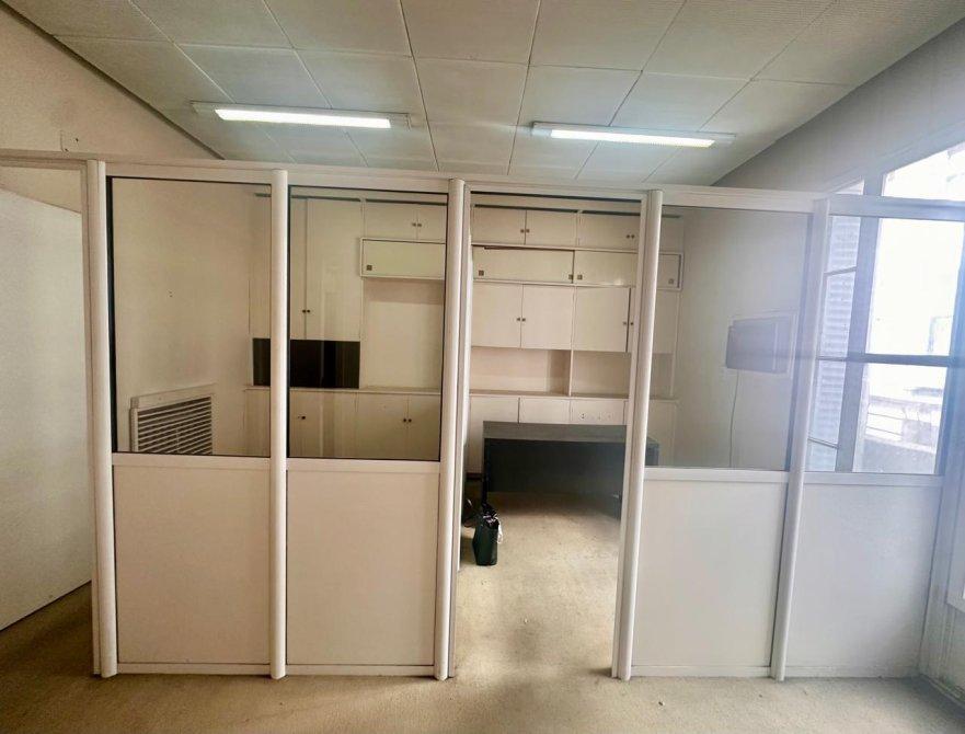 Hall distribuidor, dos espacios de escritorio vidriados con grandes placares de guardado  y un área que puede funcionar como recepción o importante sala de reuniones con un mueble empotrado de pared a pared, generando un gran espacio de guardado.