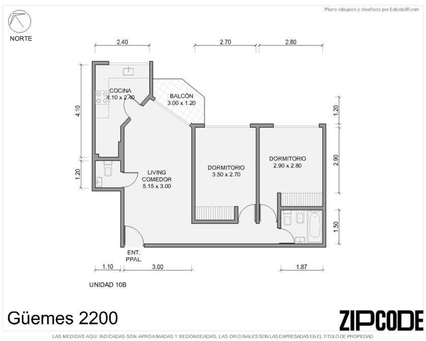 Por un pasillo de distribución, se encuentran las dos habitaciones con placar empotrado, y un baño principal completo con bañera.