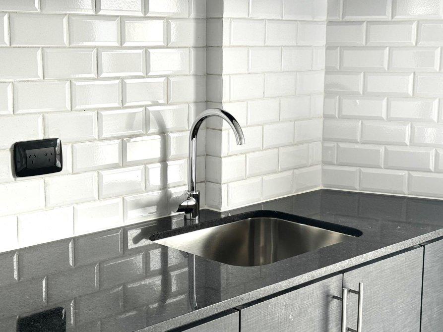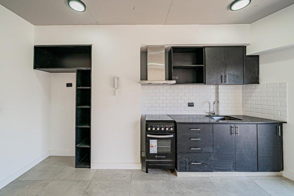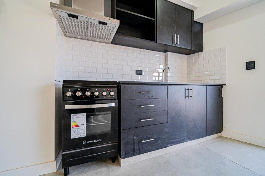 • Cocina completa equipada con muebles bajo mesada y alacenas en madera color cedro, encimera de granito negro Brasil, paredes con revestimiento tipo Subway, campana extractora Maraldi de tres velocidades, cocina con horno eléctrico, bacha de acero inoxidable Johnson y grifería FV.
