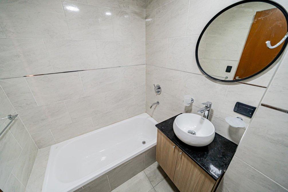 • Baño en suite con bañera de acero porcelanizado, sanitarios Ferrum, griferías FV línea Puelo, mesada de granito negro Brasil y bacha de apoyar FV línea Tori.