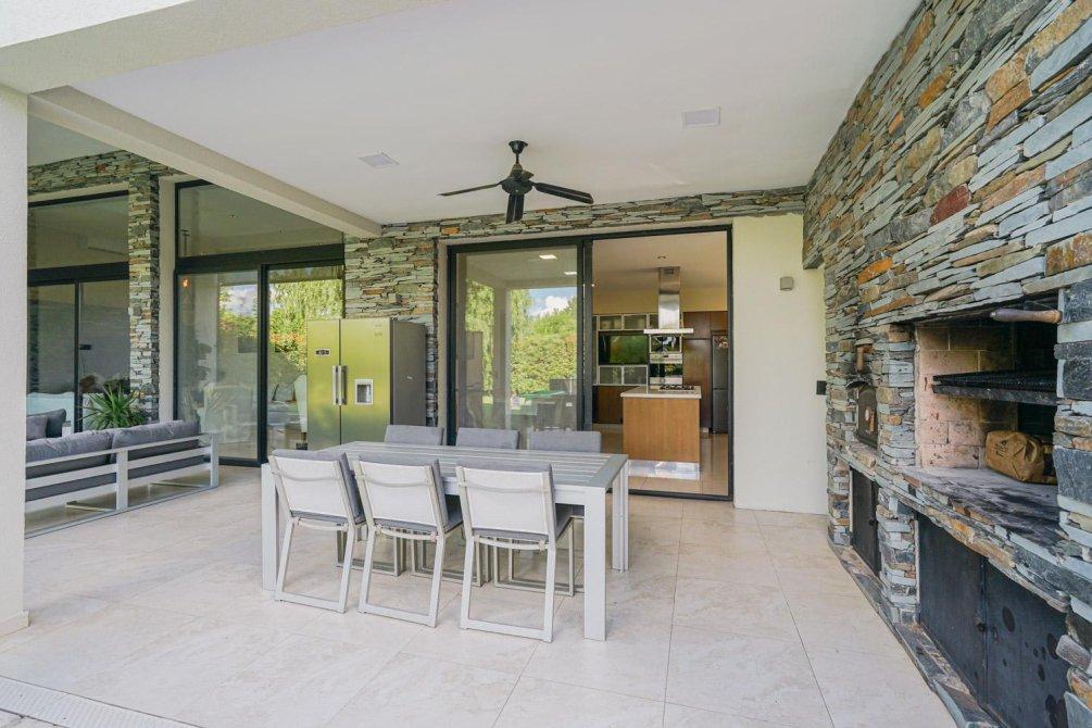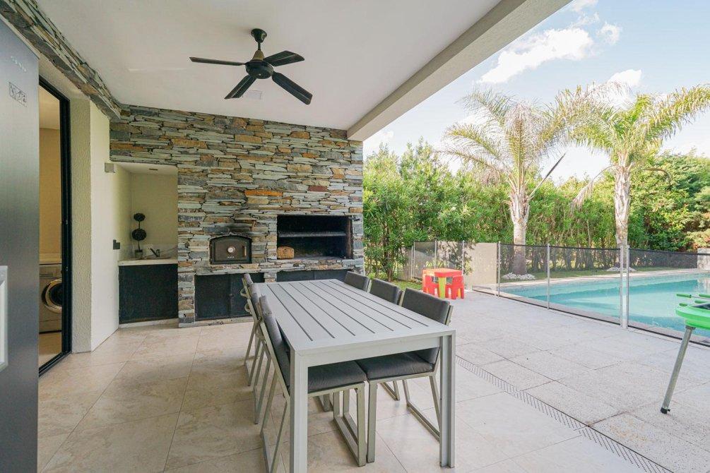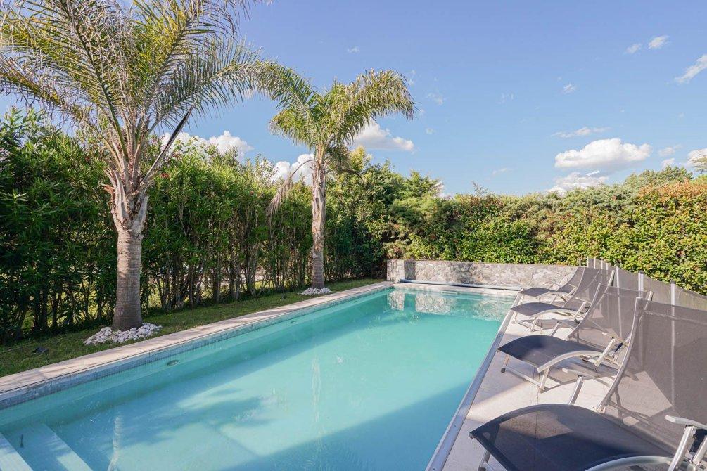 En el exterior, el parque está muy bien aprovechado y rodeado de arboleda consolidada. Más detalles!!! La casa ofrece una galería cubierta con cerramiento eléctrico para poder disfrutarla todo el año, parrilla, horno a leña y piscina climatizada revestida en venecitas con protección automática. Además cuenta con toilette exterior.