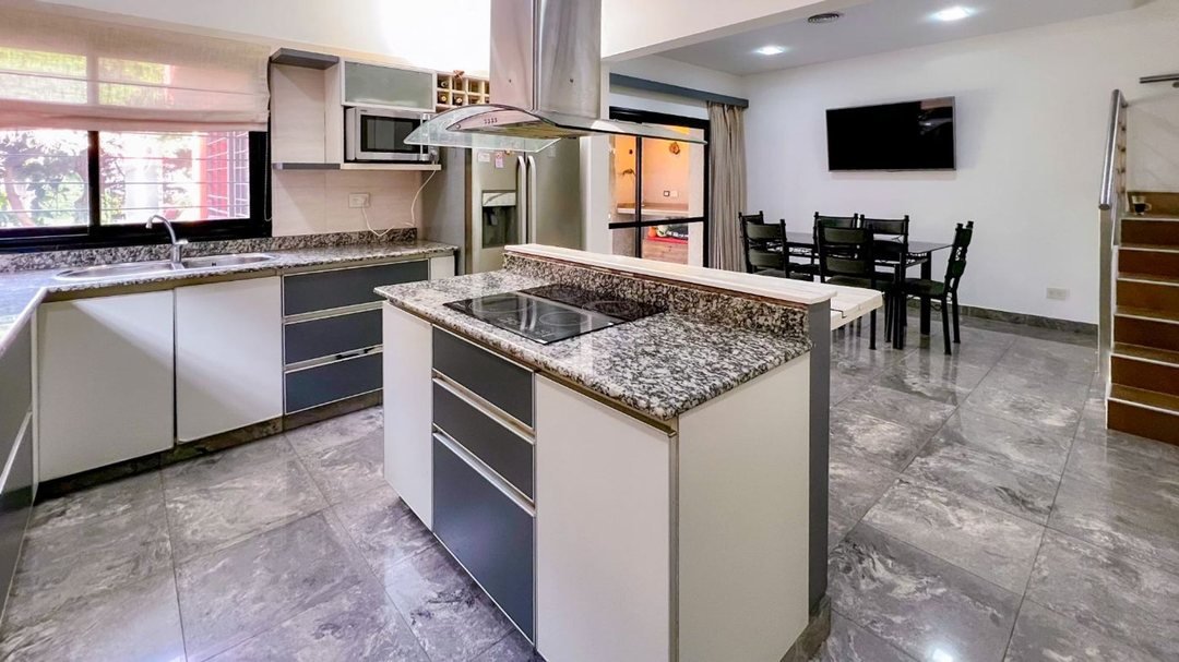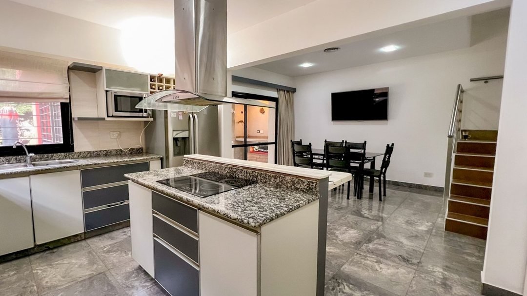 - Cocina integrada con barra desayunadora, mobiliario en melamina blanca y mesada de cuarzo.