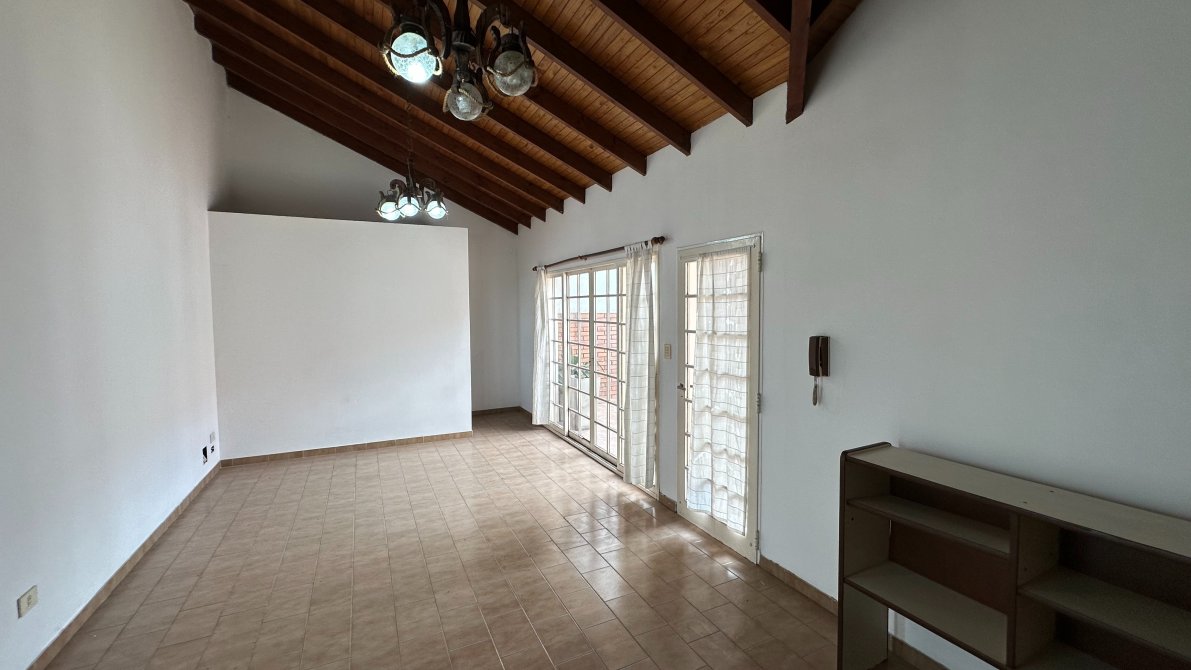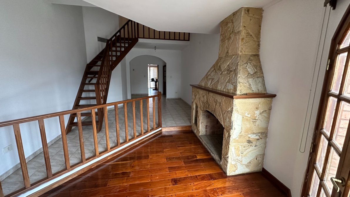 Al ingresar por la escalera principal, nos recibe un luminoso living con estufa hogar y una segunda escalera que conduce a un cómodo entrepiso o espacio multifunción.
