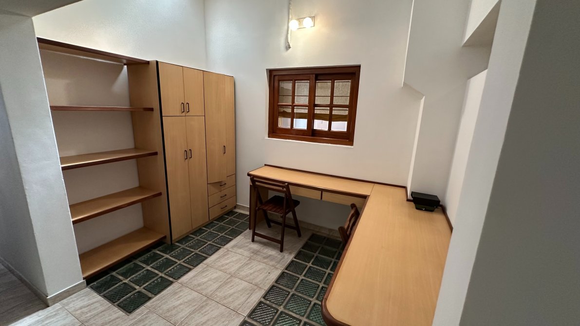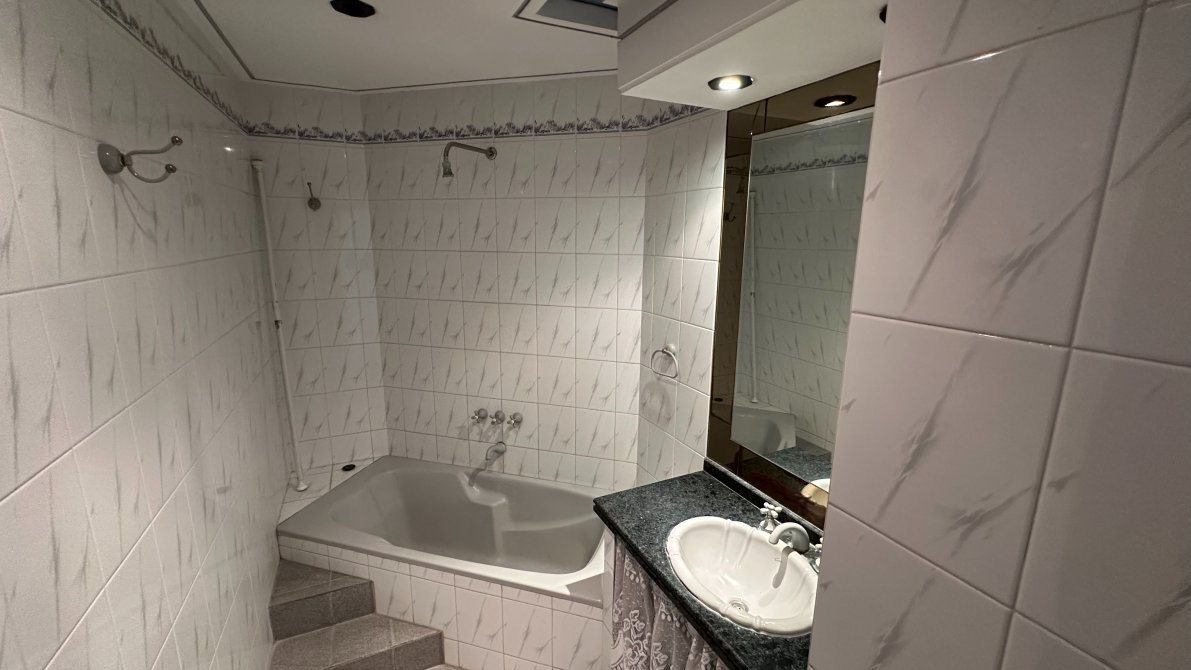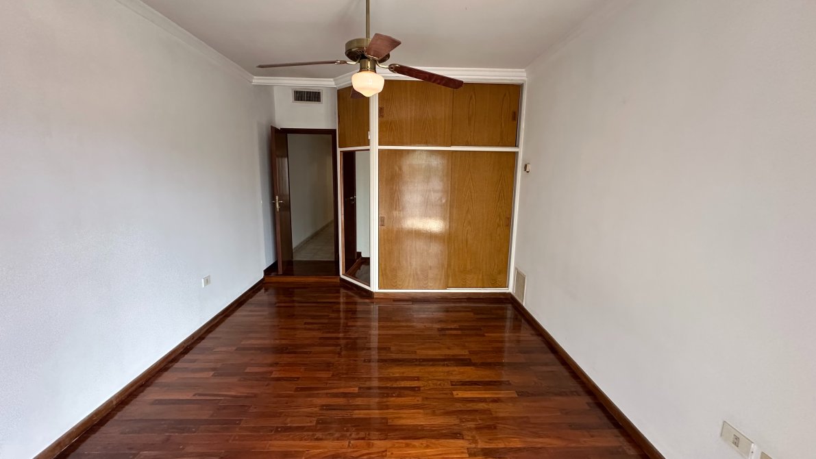 Un pasillo distribuidor nos lleva a un baño completo, y continuando, encontramos tres dormitorios con placard empotrado y ventiladores de techo, más una habitación principal amplia con aire acondicionado y otro baño completo con bañera.