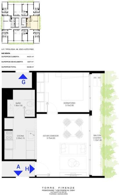 El proyecto Torre Firenze , se desarrolla sobre 9 pisos con unidades de 2 y 3 amb todas con cochera y balcón , cuenta con 2 subsuelos para un total de 66 cocheras y dos locales comerciales en planta baja.Del primero al sexto piso podremos encontrar todas unidades 2 ambientes de 53m2 a 62m2 aproximados y del séptimo al noveno piso unidades de 3 ambientes de 84m2 aproximados.