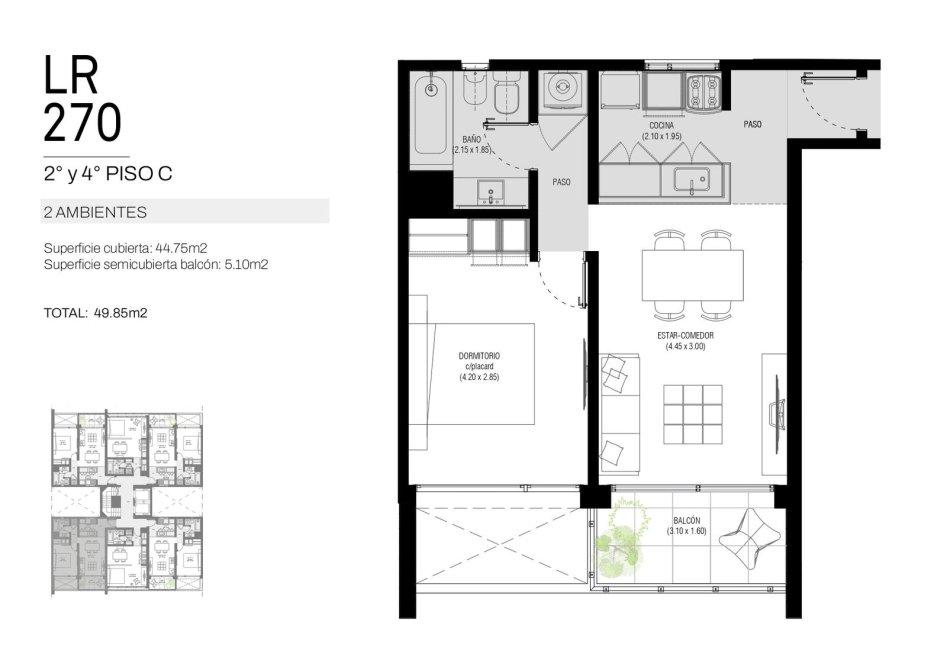 El edificio contará con 8 pisos, con 6 unidades por planta de uno y dos ambientes, y en el 8° piso unidades exclusivas de tres ambientes, todas con balcón privado que garantiza luz natural y ventilación.
