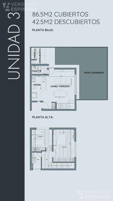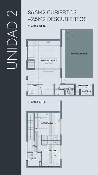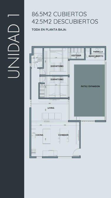 La unidad numero uno se desarrolla en planta baja:  Living comedor cocina integrada y parque con parrilla .Dos dormitorios, uno de ellos con vestidor, con interior de placard ,baño completo .