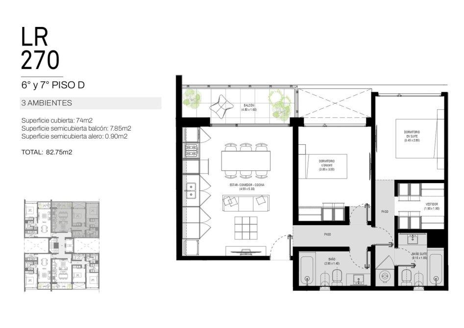 El edificio contará con 8 pisos, con 6 unidades por planta de uno y dos ambientes, y en el 8° piso unidades exclusivas de tres ambientes, todas con balcón privado que garantiza luz natural y ventilación.