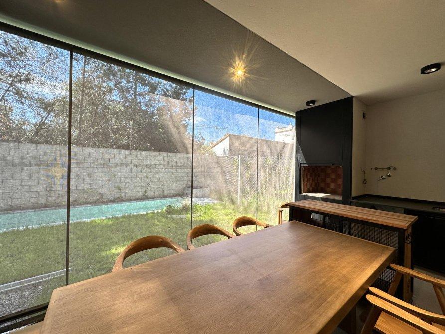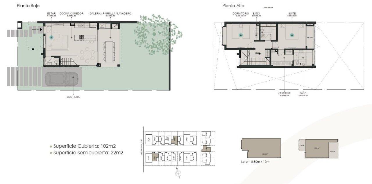 La propiedad se distribuye en dos plantas, la cual cuenta en planta baja con estar, comedor, cocina integrada con barra divisoria, toillete, galería con bacha, parrilla y jardin al fondo.En planta alta, baño completo y dos dormitorios, uno de ellos en suite con vestidor.