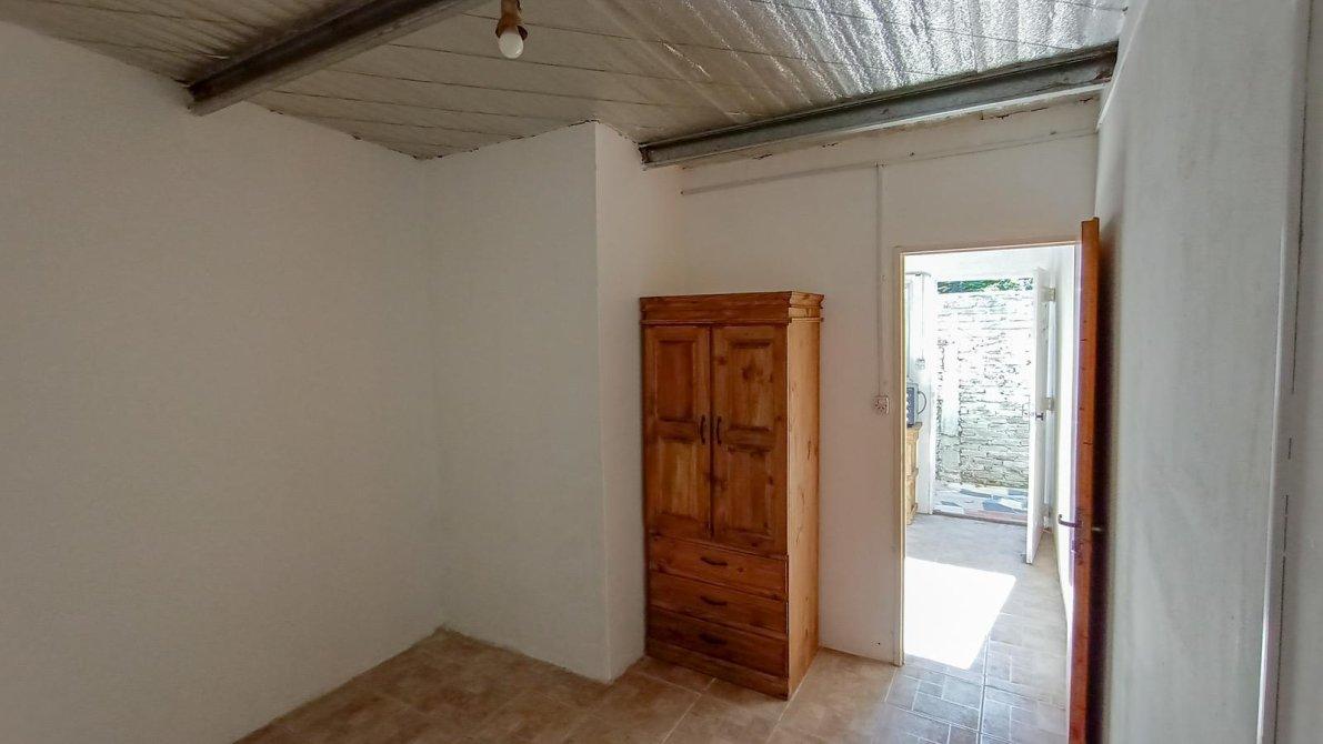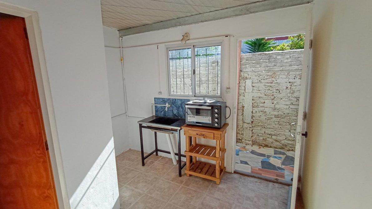 Monoambiente con Ingreso por pasillo de uso común, puerta de ingreso en chapa a sector de cocina con ventana al pasillo con reja de protección, pileta de lavar (solo agua fría), pequeño mueble de cocina en madera y anafe doble con horno eléctrico. Techos de chapa con aislante.