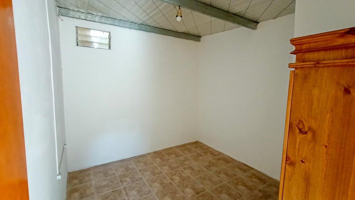 Dormitorio con pisos en cerámica, pequeño placard en madera con puerta y cajonera con ventiluz con tres vidrios.