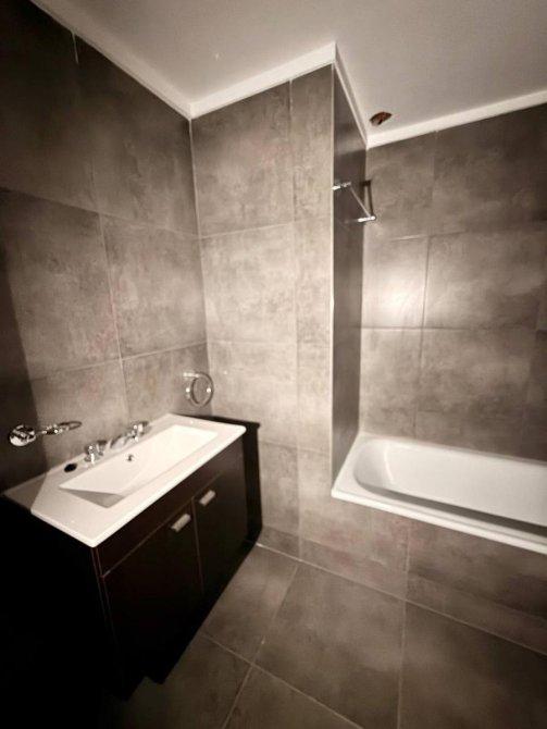 El baño, totalmente revestido en cerámicos de tono gris, cuenta con bañera, vanitory y grifería moderna, logrando un estilo contemporáneo y sobrio.