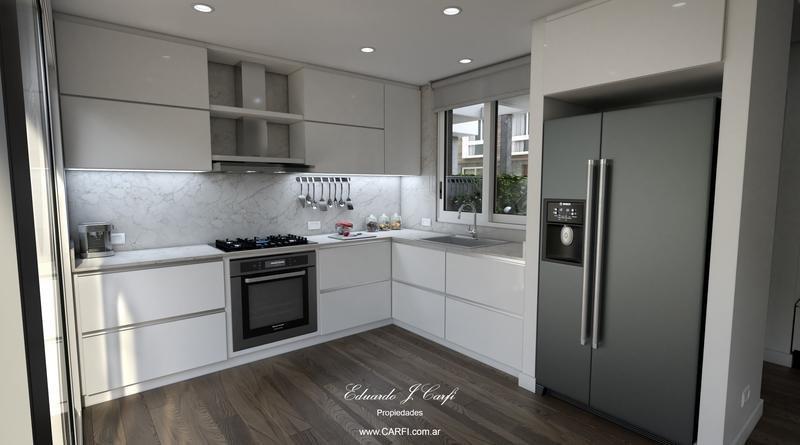 En su planta baja se desarrolla el living comedor, cocina sobre un lateral con vista al jardín. Un toilette para la visita, garage para un auto.