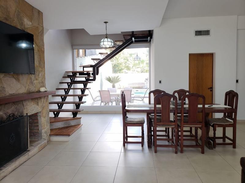 En su planta baja dispone de amplio y luminoso living comedor con hogar, toilette, amplia cocina con vista al parque. Garage para un auto y entrada para dos mas. Parque con piscina de material, quincho con parrilla.