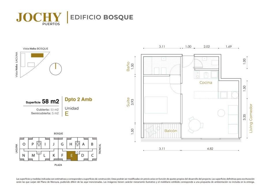 Superficie Total: 58 m² (53 m² Cubiertos + 5 m² Balcon).
