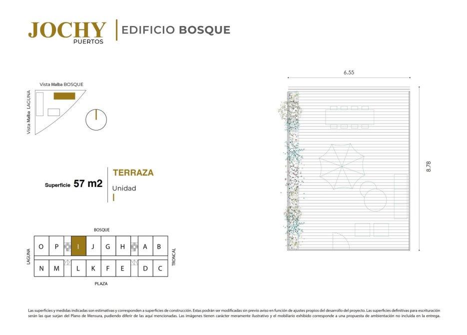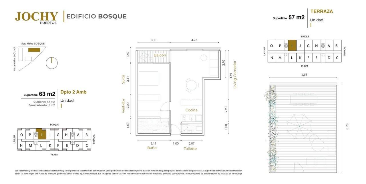 Superficie Total: 63 m² (58 m² Cubiertos + 5 m² Balcón). Superficie Terraza: 57 m².