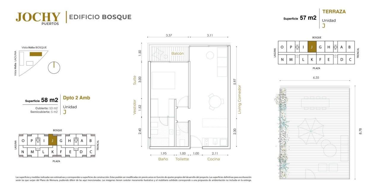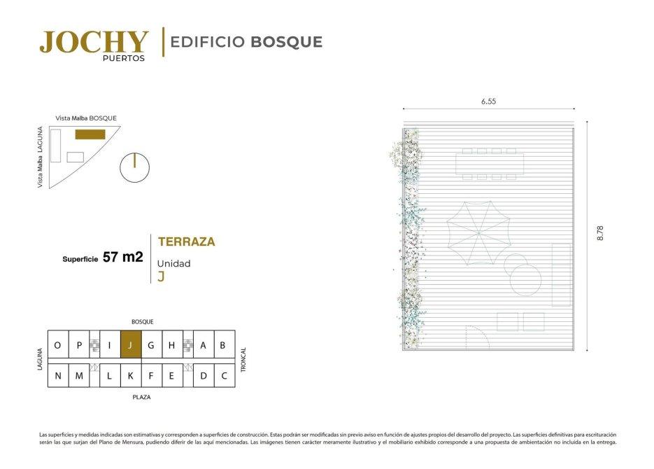Superficie Total: 58 m² (55 m² Cubiertos + 5 m² Balcón). Superficie Terraza: 57 m².