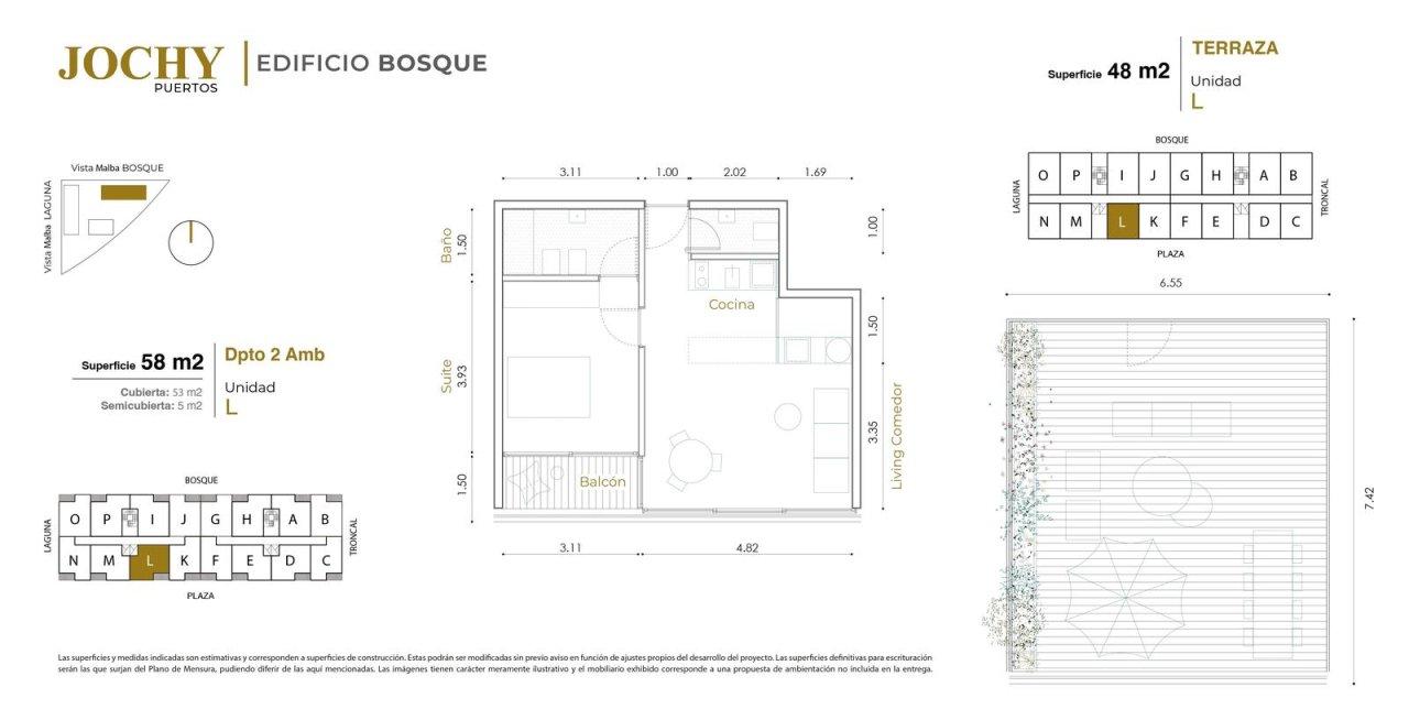 Superficie Total: 58 m² (53 m² Cubiertos + 5 m² Balcón). Superficie Terraza: 48 m².