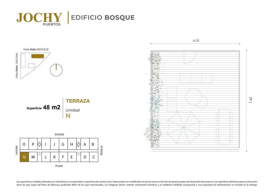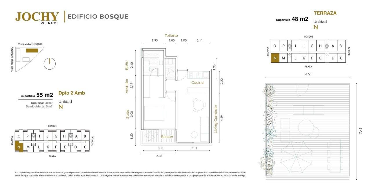 Superficie Total: 55 m² (50 m² Cubiertos + 5 m² Balcón). Superficie Terraza: 48 m².