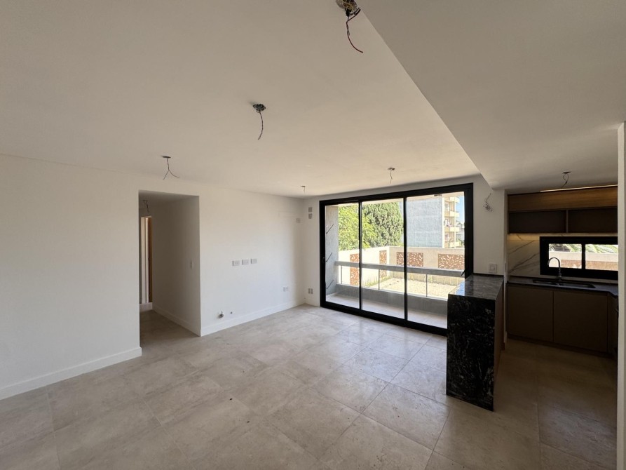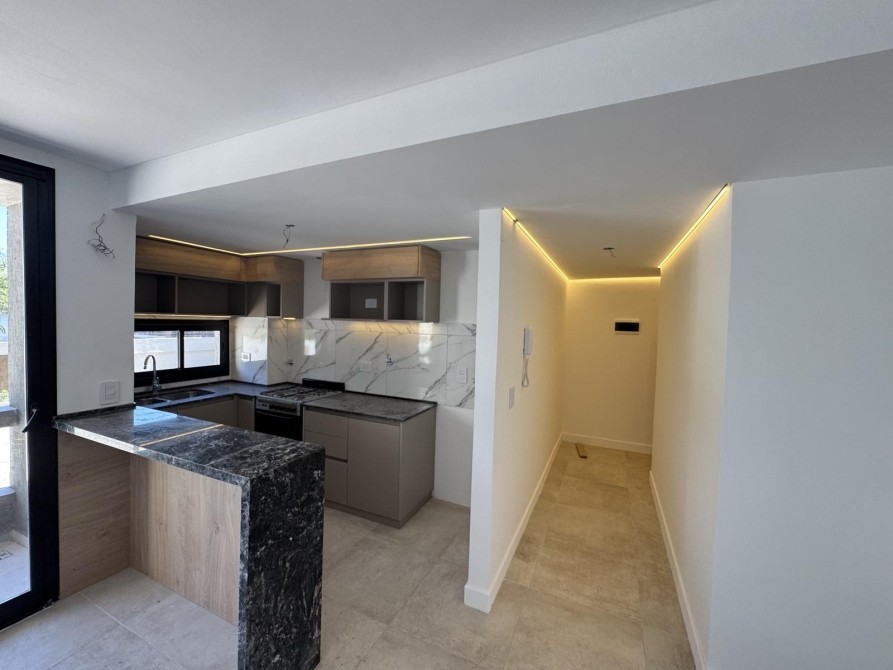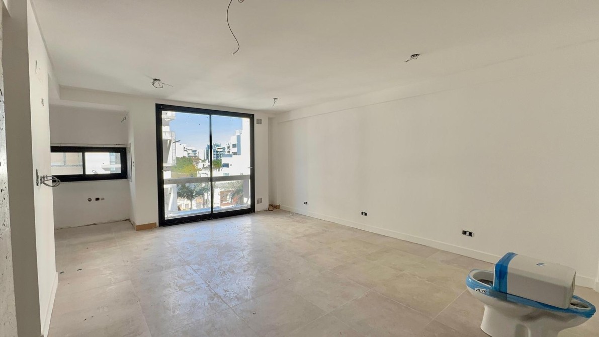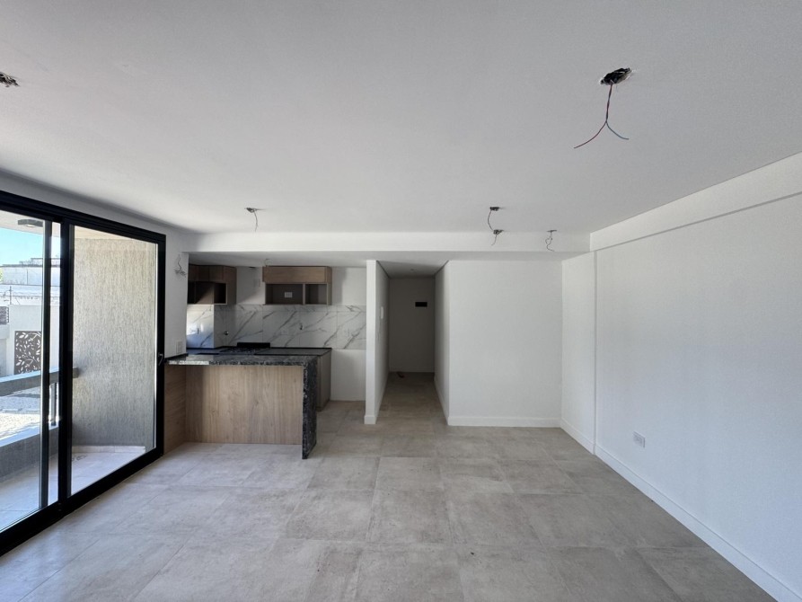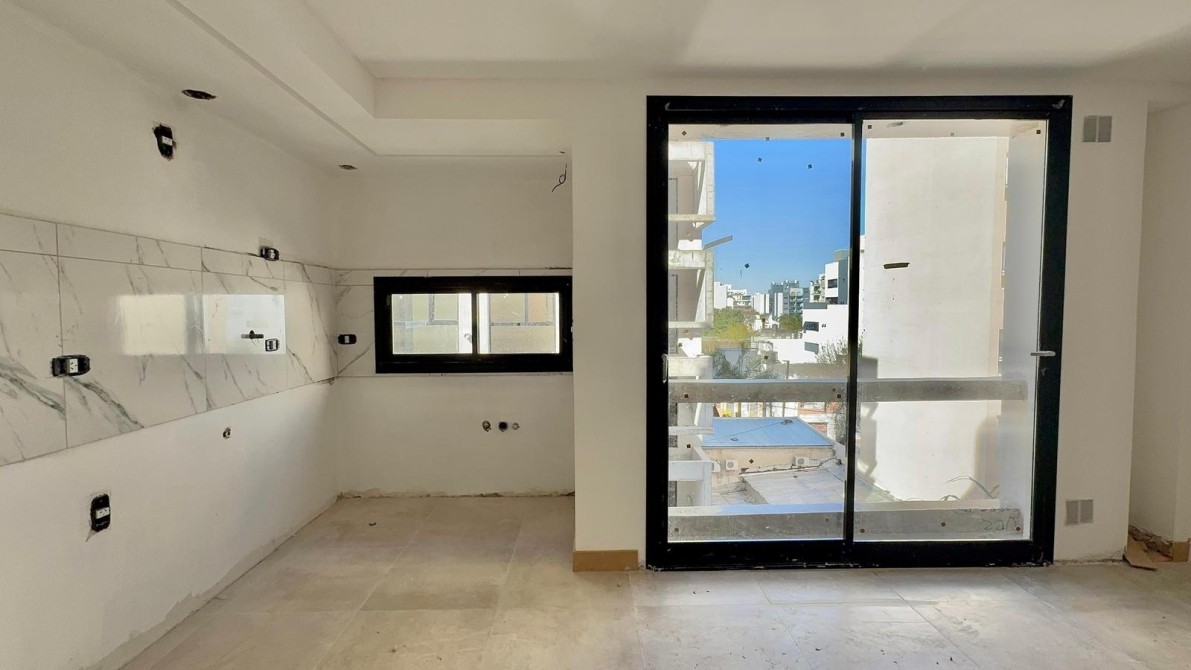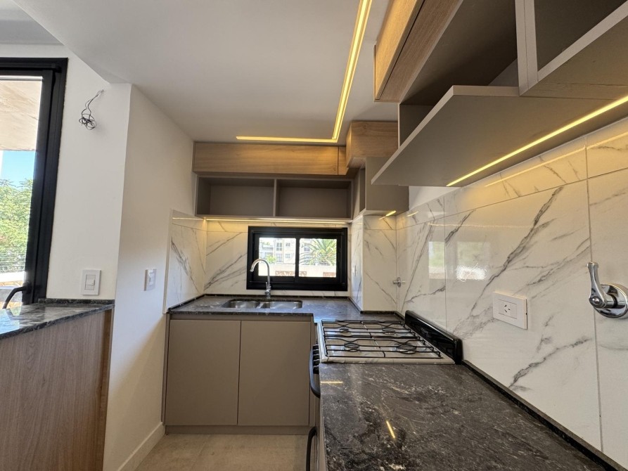 Al ingresar al departamento nos encontramos con un amplio y luminoso living-comedor con salida al balcón mediante ventanas de piso a techo, marcos de aluminio con un acabado en negro. La cocina la cual esta semi inegrada con una barra y cuenta con muebles bajo mesada, alacena, mesada de granito con bacha de acero inoxidable y grifería monocomando de primera calidad.
