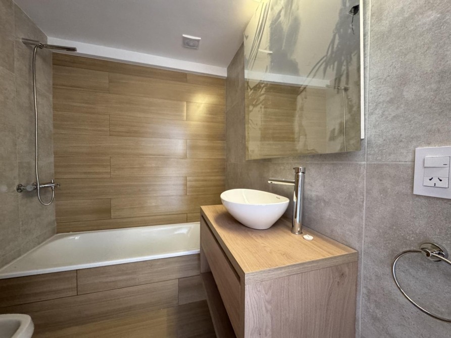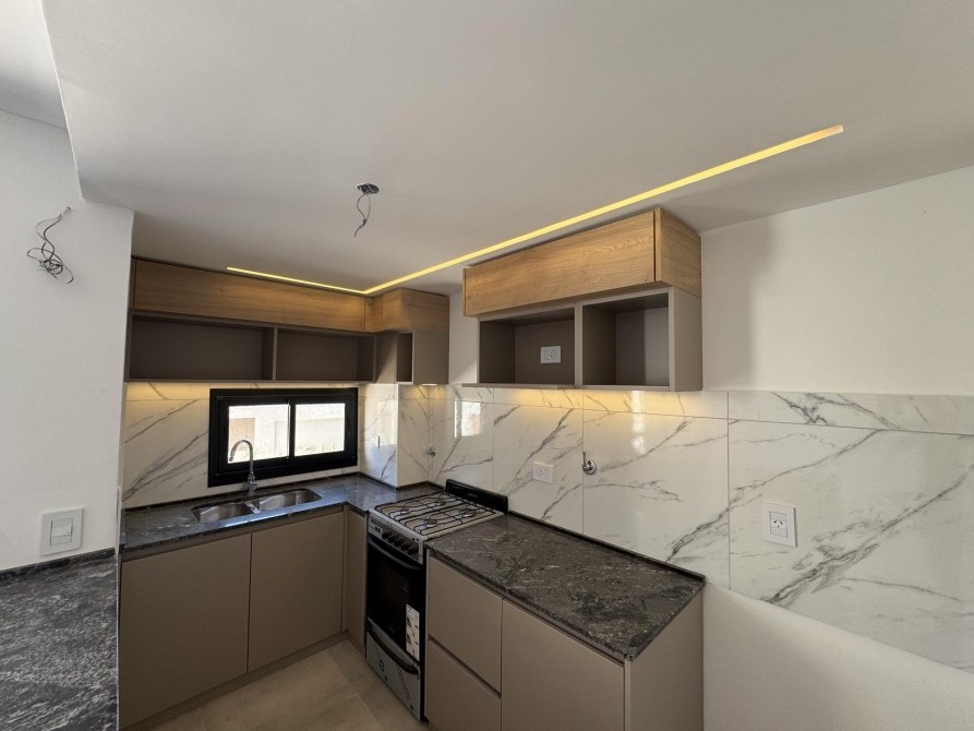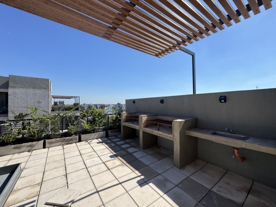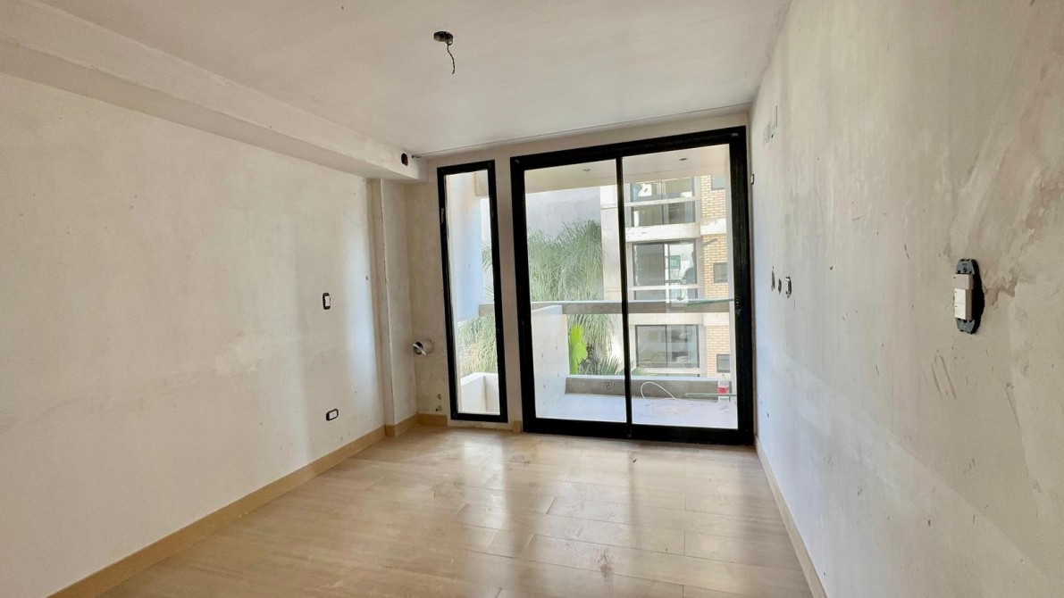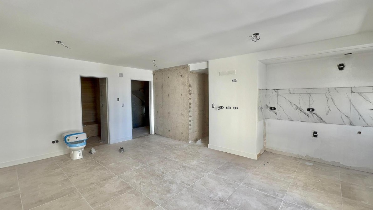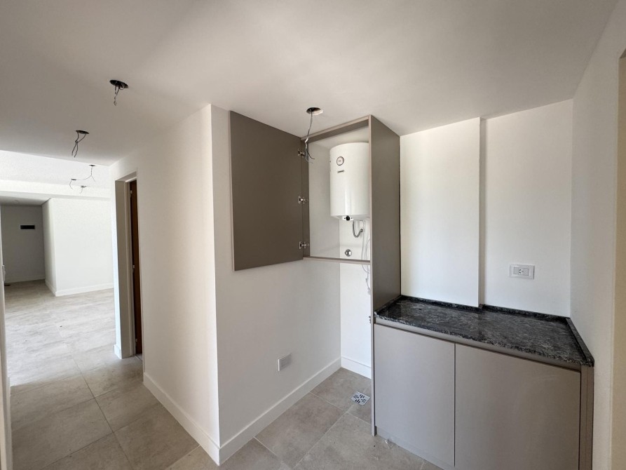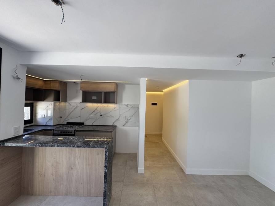 Al ingresar al departamento nos encontramos con un amplio y luminoso living-comedor con salida al balcón mediante ventanas de piso a techo, marcos de aluminio con un acabado en negro. La cocina la cual esta semi inegrada con una barra y cuenta con muebles bajo mesada, alacena, mesada de granito con bacha de acero inoxidable y grifería monocomando de primera calidad.