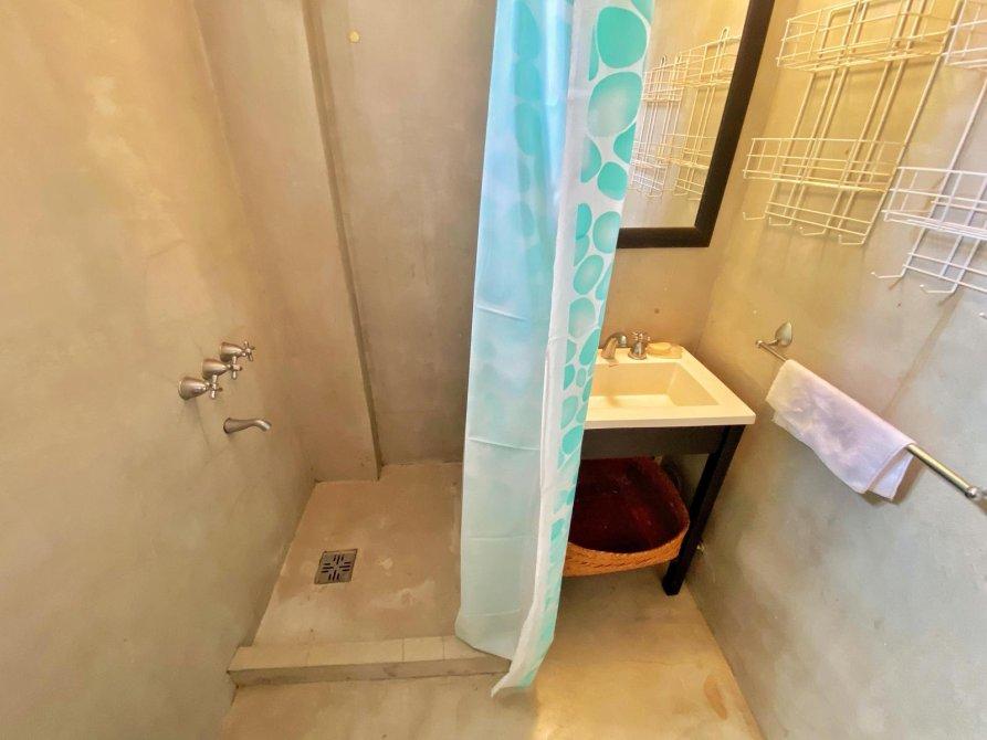 - El baño cuenta con un inodoro, bacha, espejo y ducha, con duchador y estantes de material embutidos.