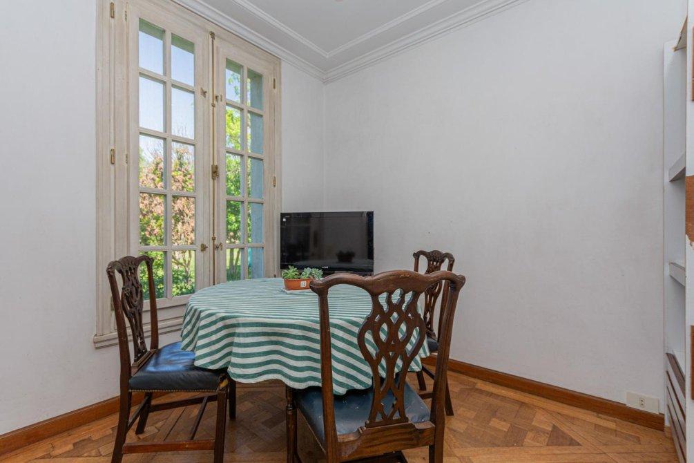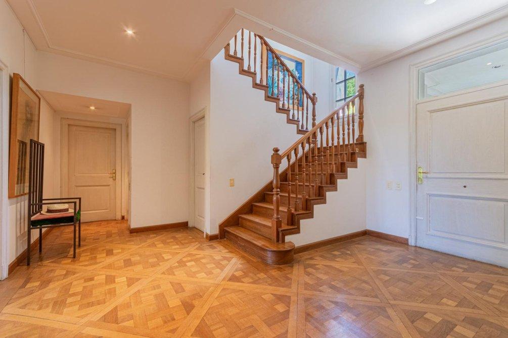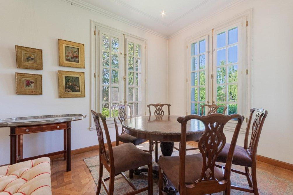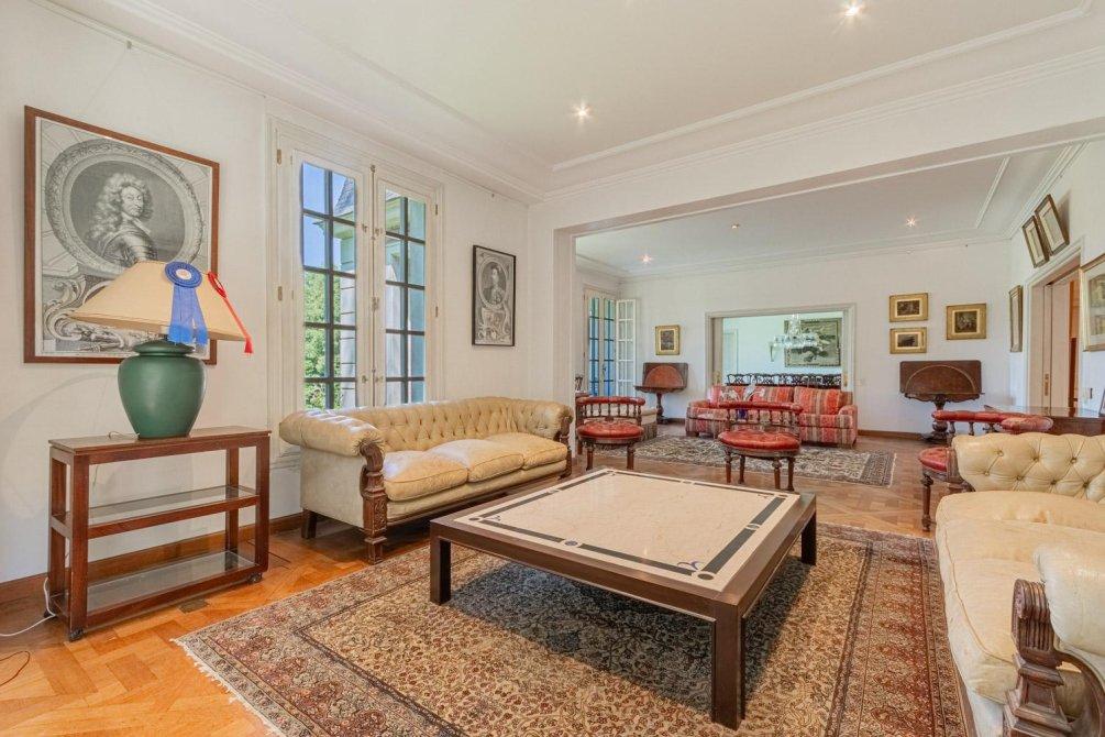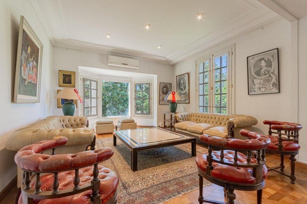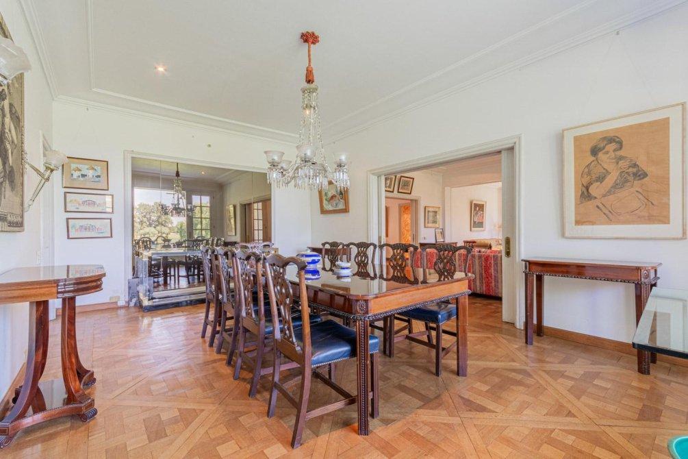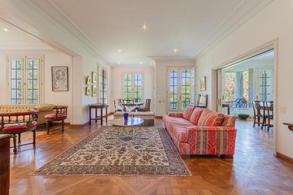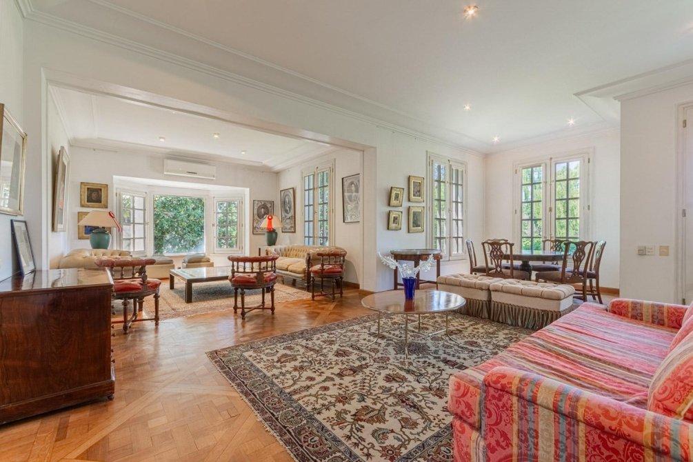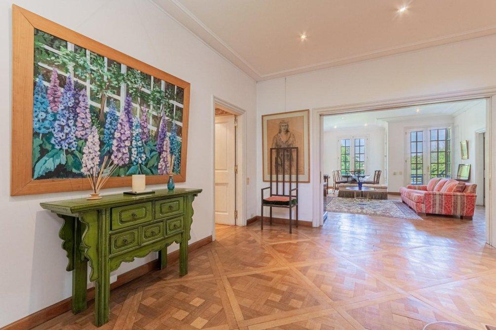 Se entra a un amplio hall de recepción, de allí a un gran living que articula tres sectores conectados, y a un comedor con puerta doble corrediza empotrada. Todo este amplio espacio de recepción tiene piso de elegante parqueterie en damero de roble de Eslavonia, todo con una calidad de materiales inusual hoy en día.