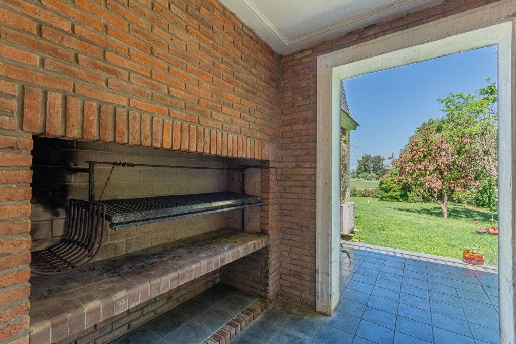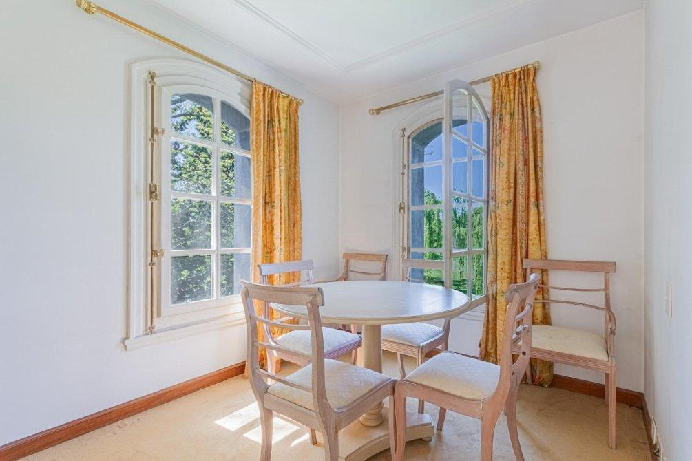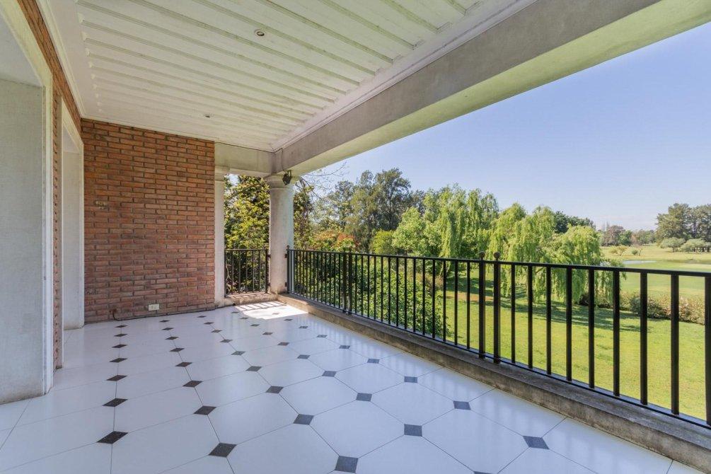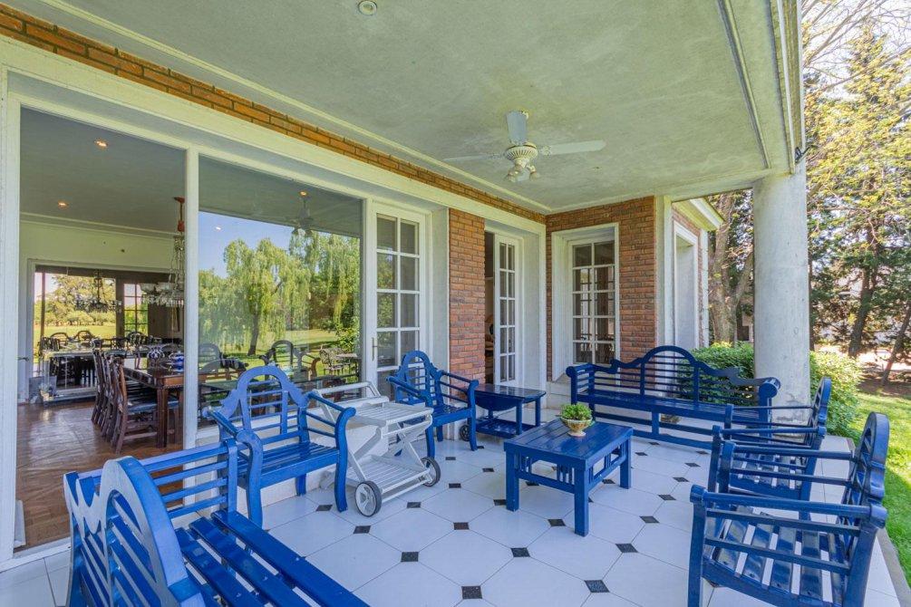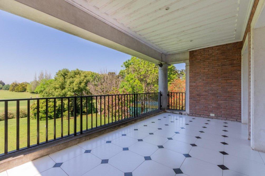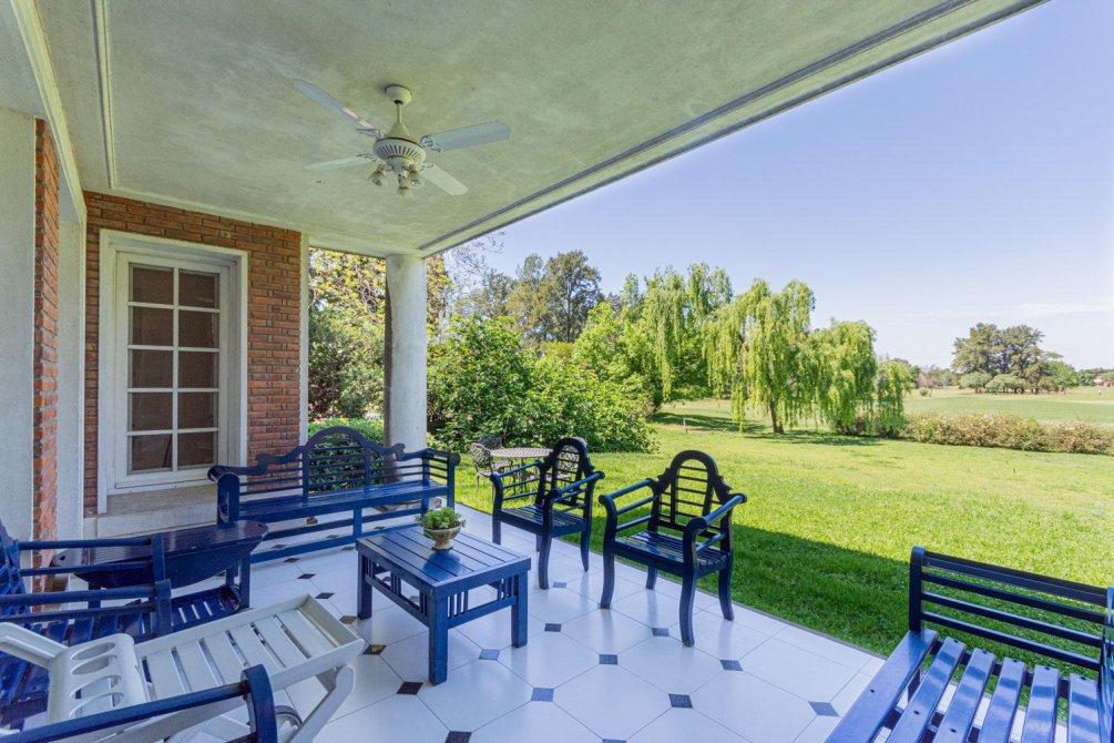 Se destaca un bow window que remata el living y la vista al jardín y al campo de golf a través de altos ventanales reticulados. La recepción se abre a una hermosa galería cubierta sobre el jardín y el golf, con columnas clásicas y piso en damero.