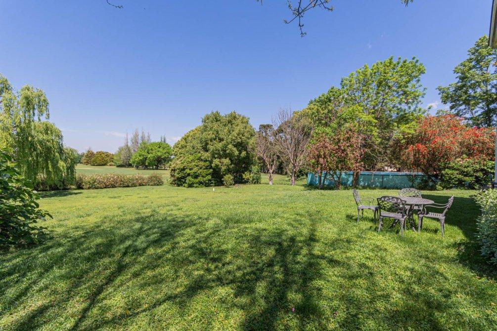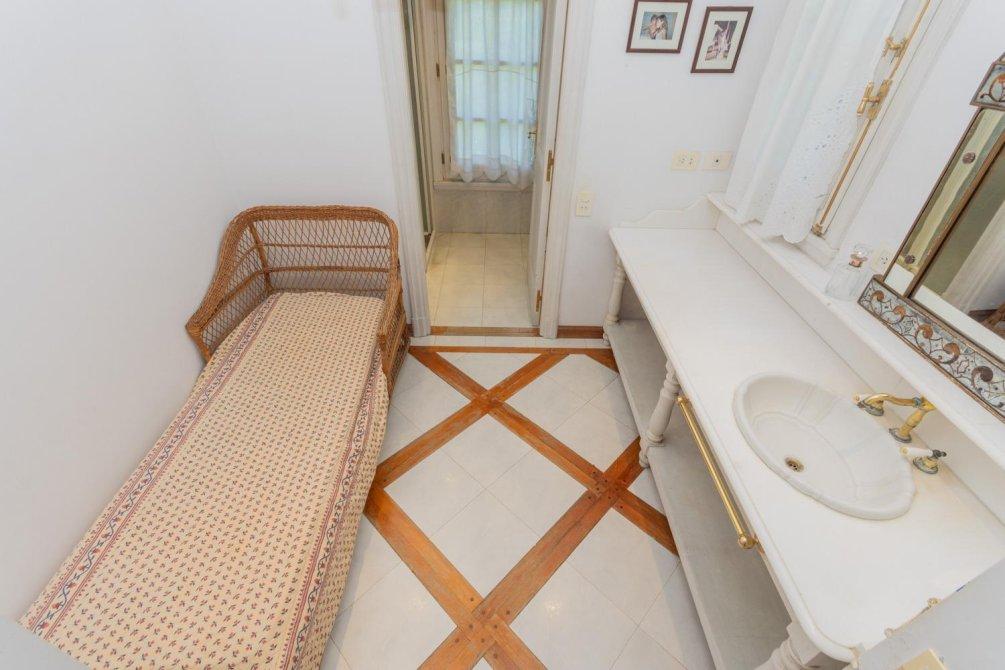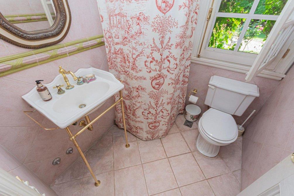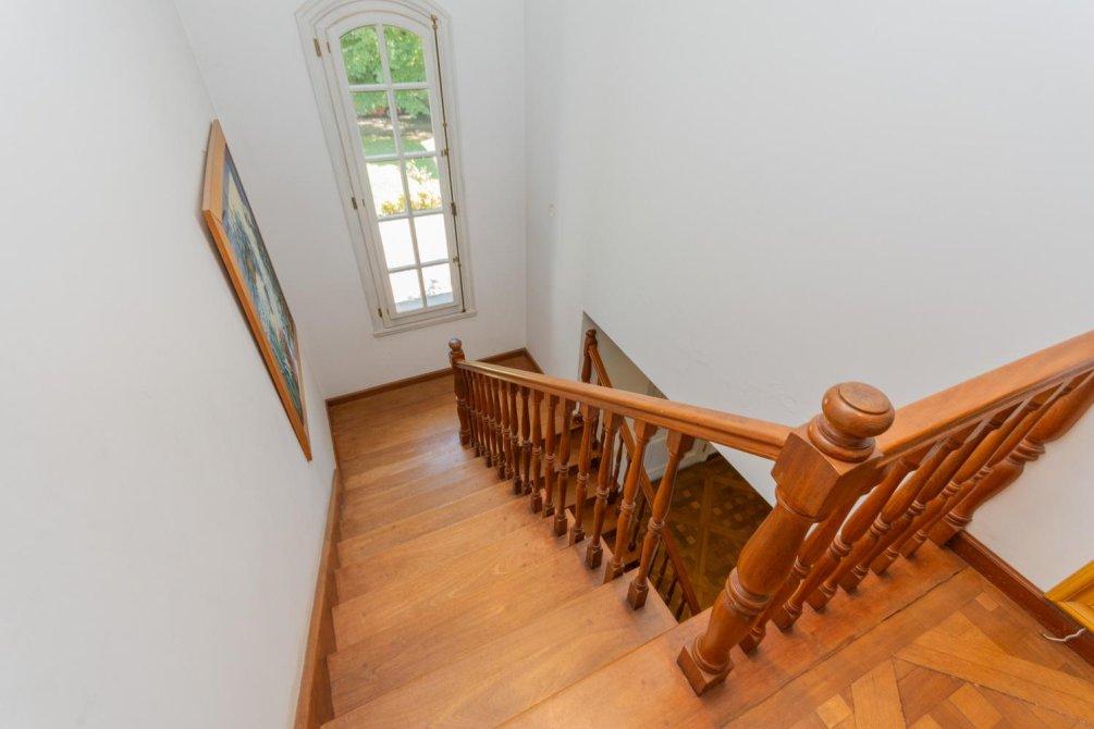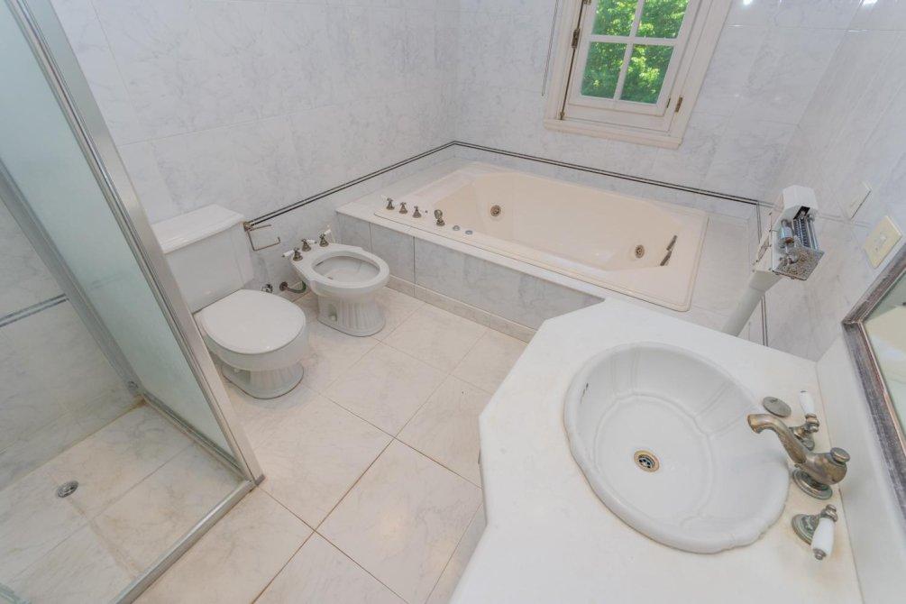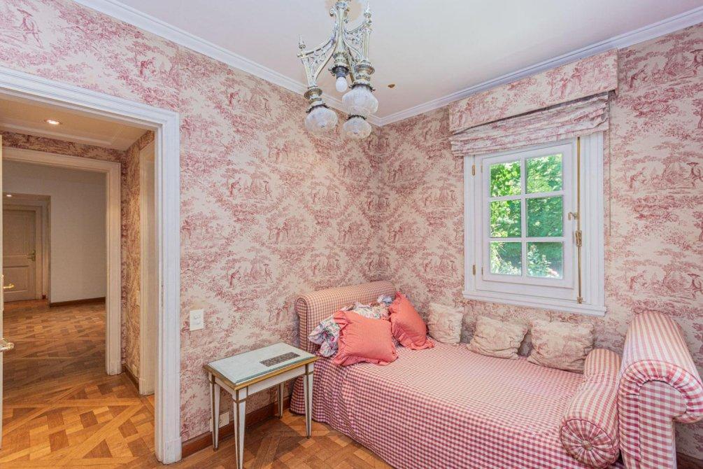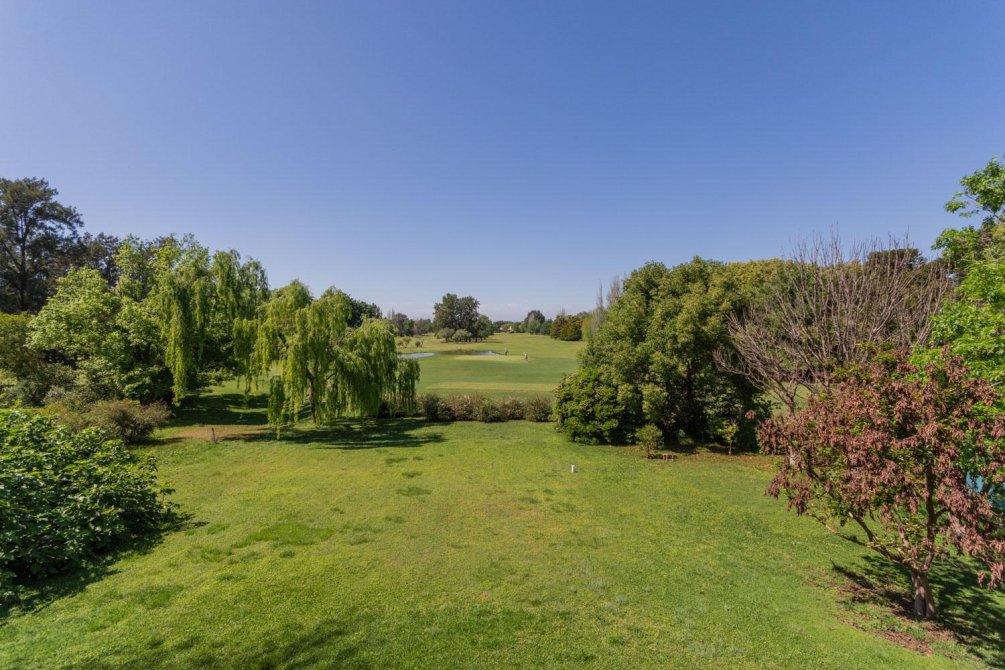 Se destaca un bow window que remata el living y la vista al jardín y al campo de golf a través de altos ventanales reticulados. La recepción se abre a una hermosa galería cubierta sobre el jardín y el golf, con columnas clásicas y piso en damero.