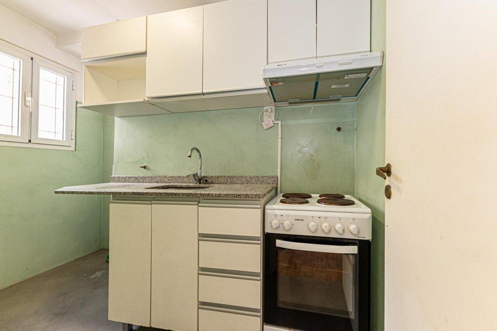 Cocina independiente (no kitchenette), eléctrica, con muebles bajo y sobre mesada, espacio para heladera, extractor de aire y barra desayunadora